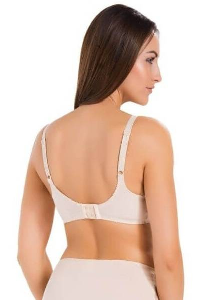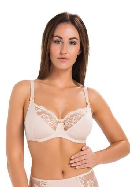 Górę miseczek zdobi delikatna kwiatowa koronka. Biustonosz posiada cięcia: pionowe i poziome, które unoszą piersi, jednocześnie je modelując. Głębokie miski zakrywają całe piersi, ale ich nie przecinają. Biustonosz jest wyżej zabudowany z boku, co zapewnia większy komfort noszenia. Ramiączka są regulowane, a ich szerokość zależy od rozmiaru.