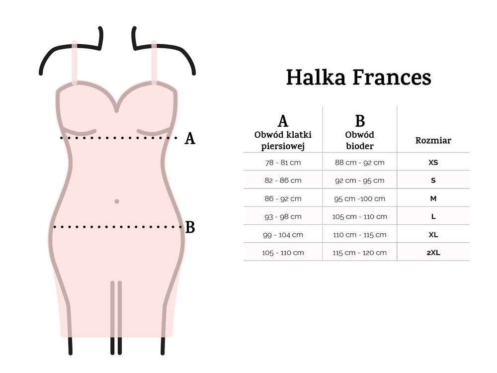 Halka Frances, czyli połączenie erotyki z elegancją. Zmysłowa haleczka wykonana z satyny z pewnością sprawi, że Twój ukochany nie będzie mógł oderwać od ciebie wzroku. Górę halki tworzą dopasowane profilowane miseczki wykonane z delikatnej koronki. Ramiączka haleczki są cienkie i można je regulować.