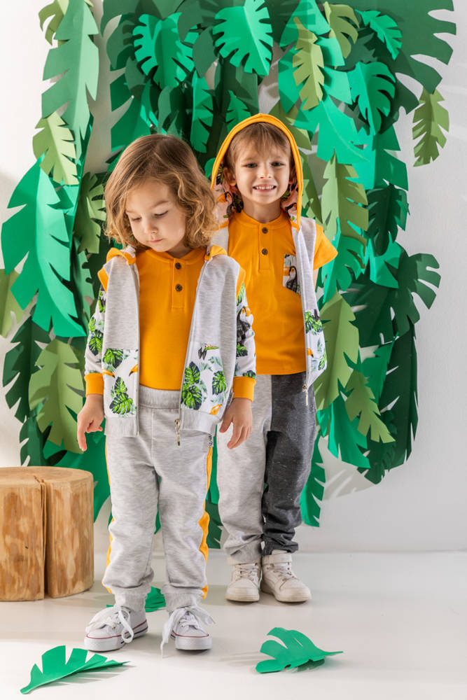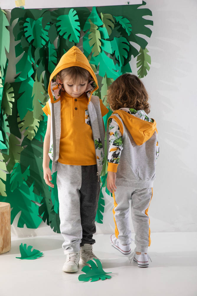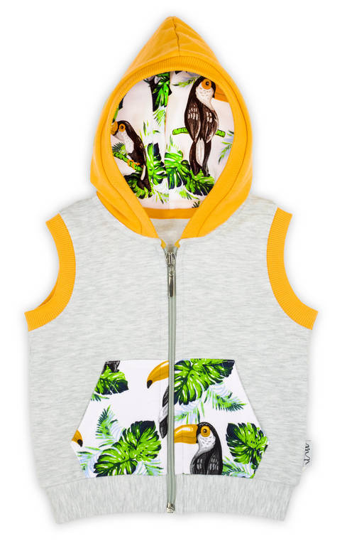 Sportowy bezrękawnik z kapturem dla chłopca, uszyty z szarej bawełny dresowej z dodatkami pomarańczu. Obwód pachy, kaptura oraz pas został wykończony ściągaczem. Zapinany jest na zamek. Produkt posiada kieszonki w jaskrawe kolory w motywy tukanów. Materiał posiada certyfikat Oeko-Tex Standard 100 Tekstylia godne zaufania.