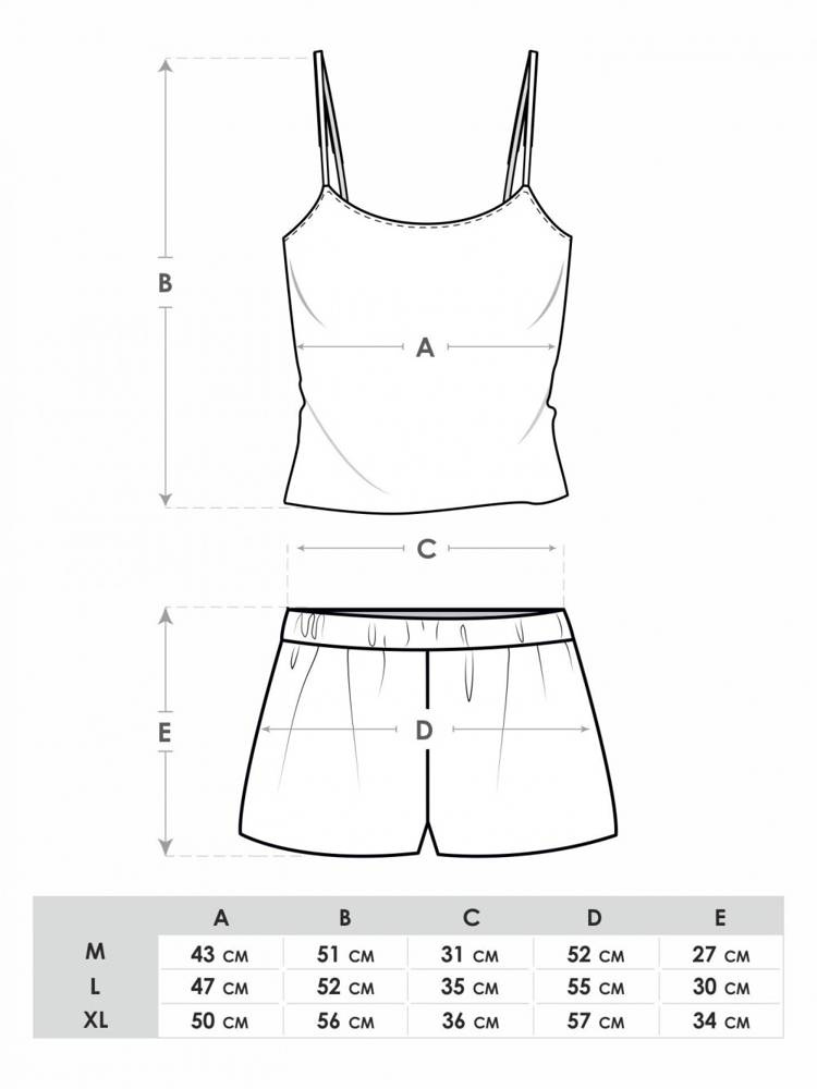 Letnia piżama damska wykonana z wysokiej jakości delikatnej, satyny. Bluzeczka na wąskich ramiączkach o zmysłowym kroju. Spodenki bardzo ładnie układają się na biodrach. W pasie wygodna, nieuciskająca guma. Bardzo stylowy fason, delikatnie dopasowany do ciała. Spodoba się kobietom, które uwielbiają delikatność i swobodę.