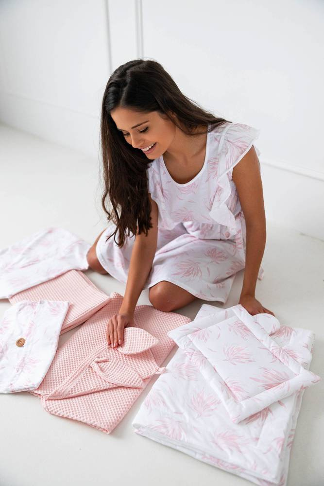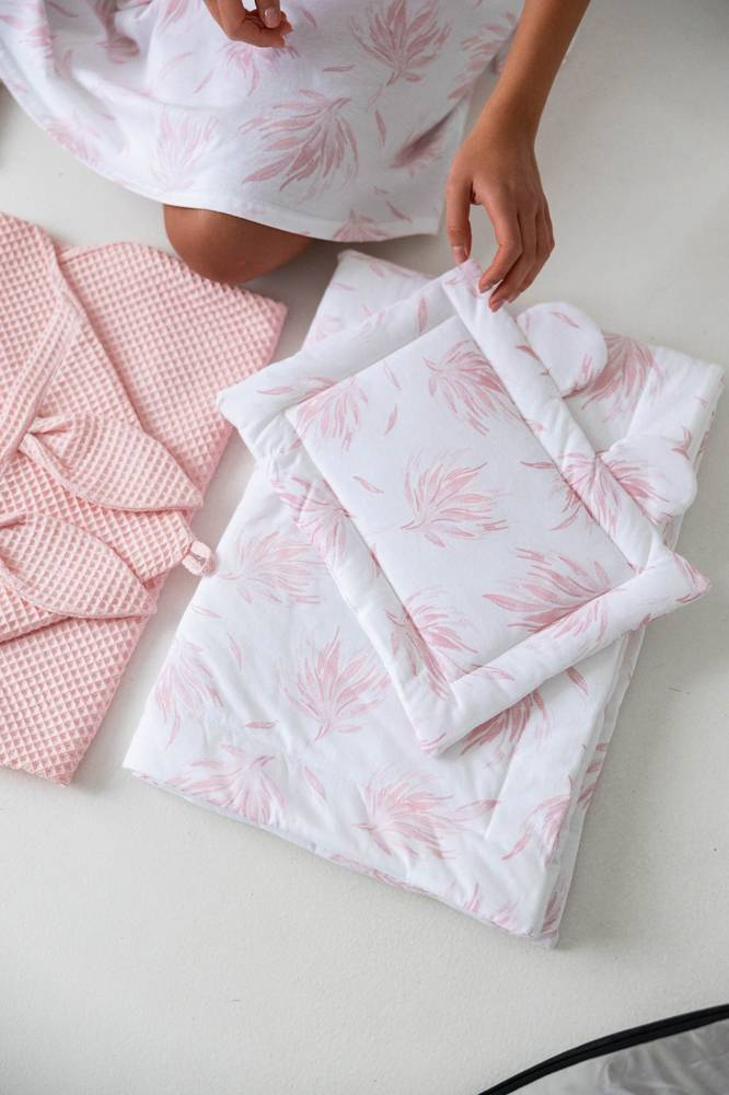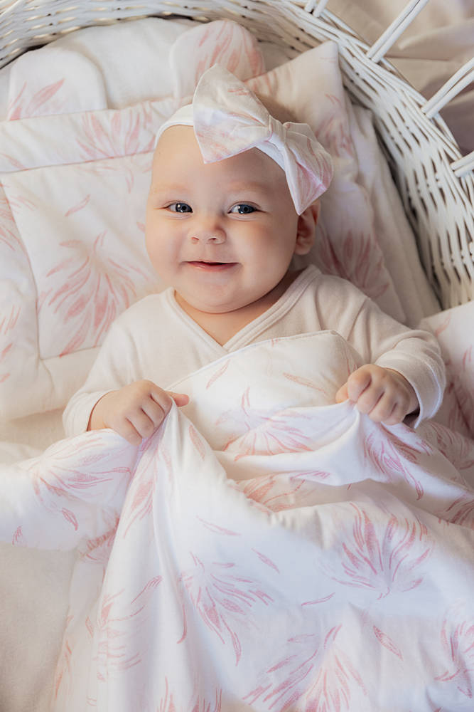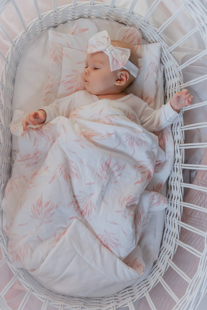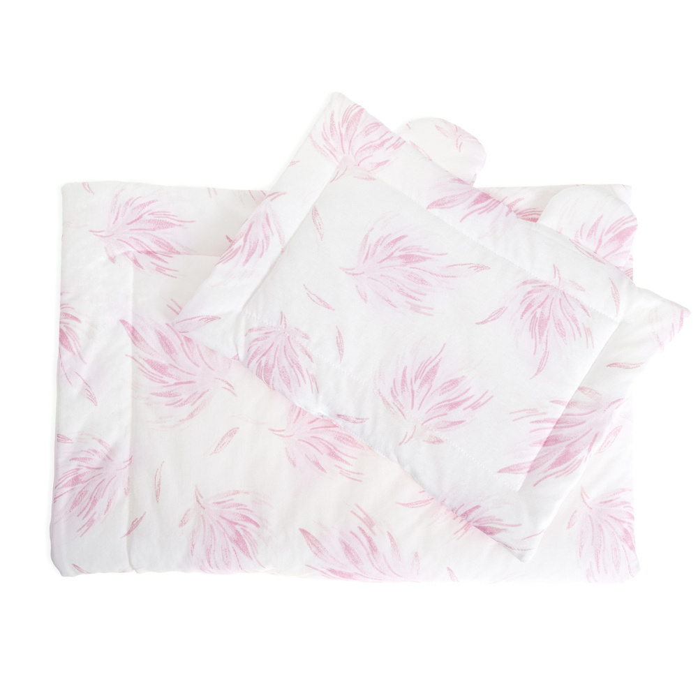 Komplet pościeli niemowlęcej Margaret. Model z wysokiej jakości bawełny. Jedna strona kołderki wzorzysta, druga biała - poduszeczka z ozdobnymi uszkami. Skład: 100% bawełna