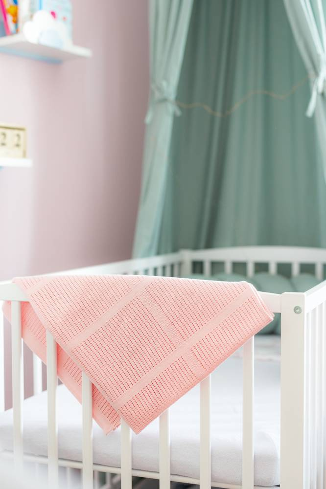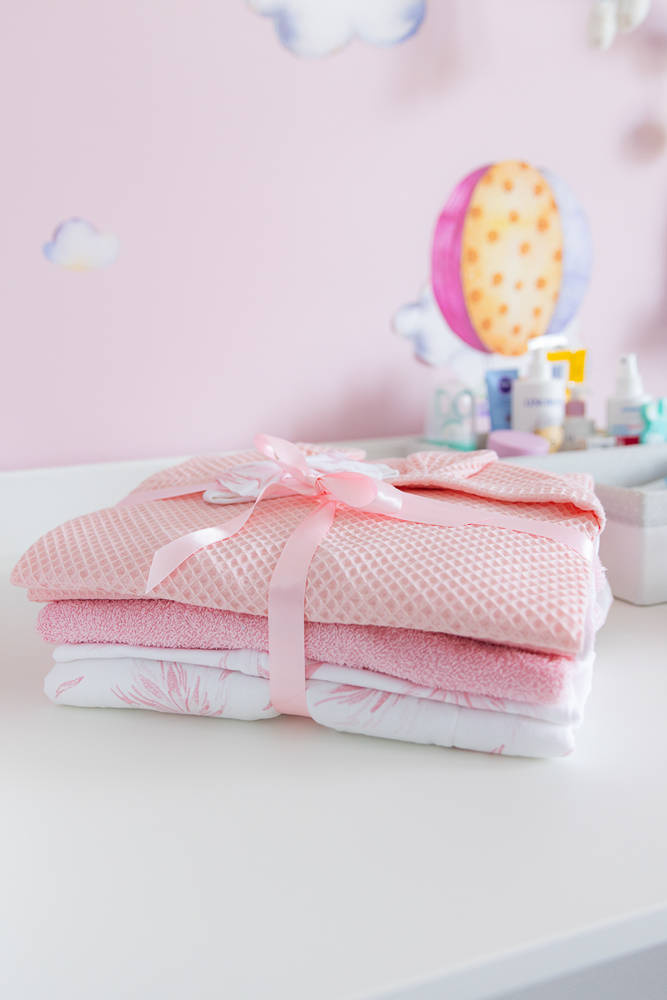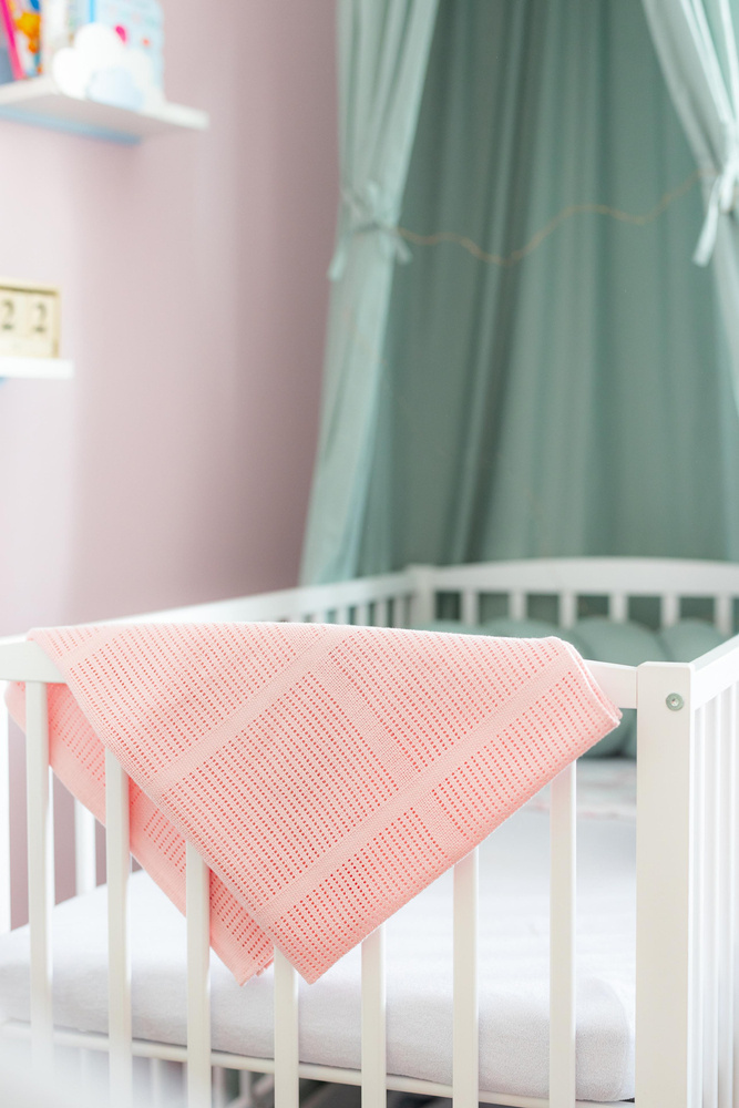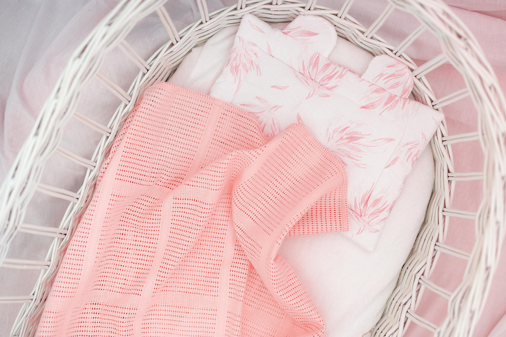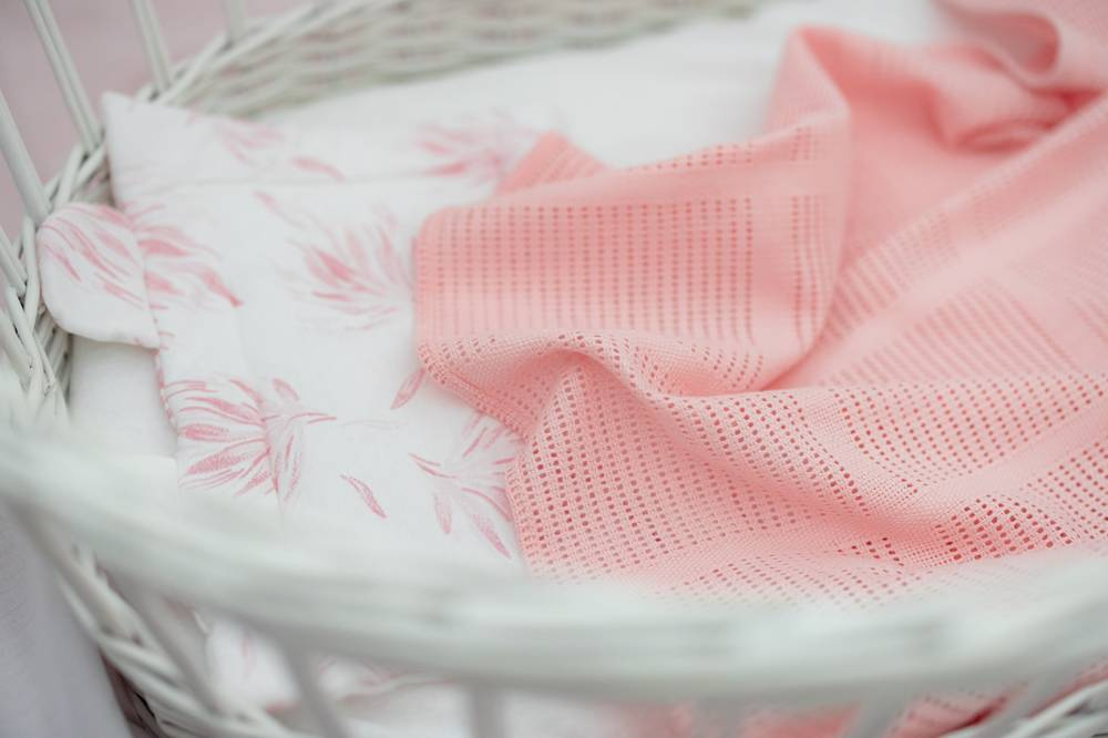 Dwustronny kocyk wykonany z wysokiej jakości bawełny. Z jednej strony delikatny wzór w piórka, z drugiej dzianina o strukturze wafla.