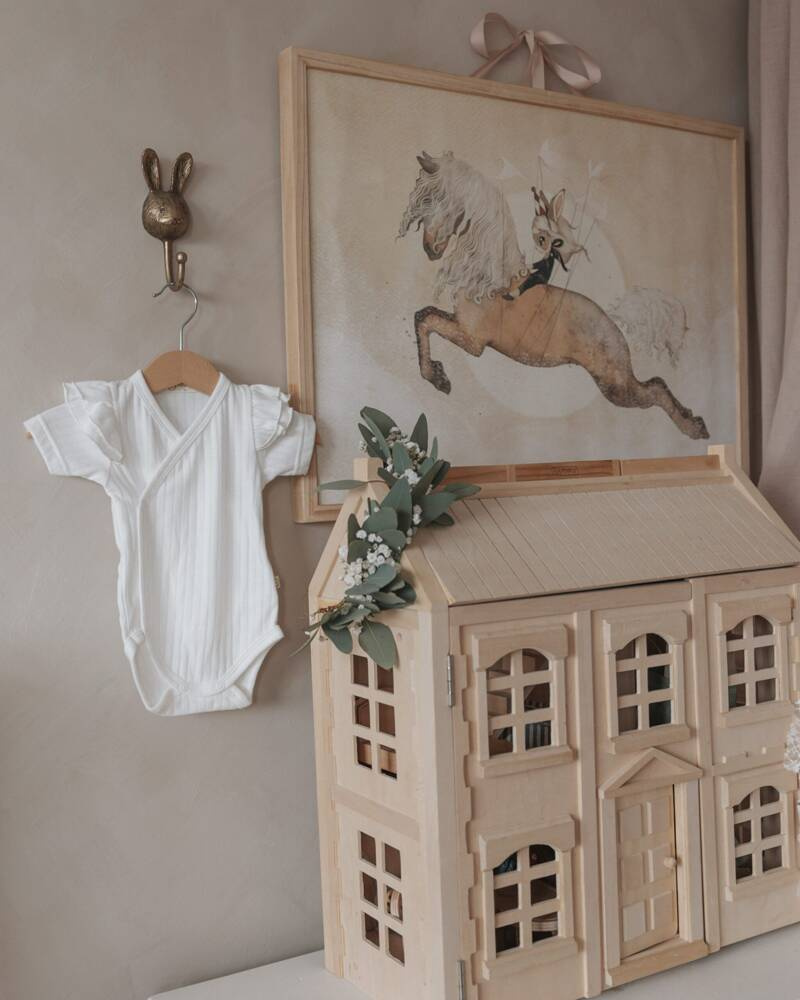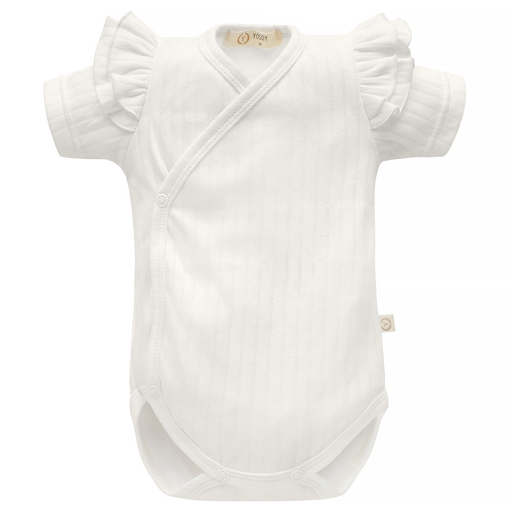 Body z krótkim rękawem wykonane z wysokiej jakości delikatnej w dotyku bawełny. Posiada urocze falbanki na ramionkach. Rozpinane na całej długości na specjalne zatrzaski. To wygodne rozwiązanie ułatwia przewijanie i ubieranie maluszka. Body to niezbędny element niemowlęcej wyprawki.