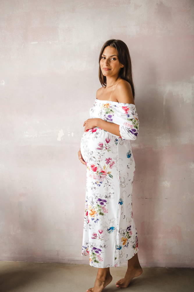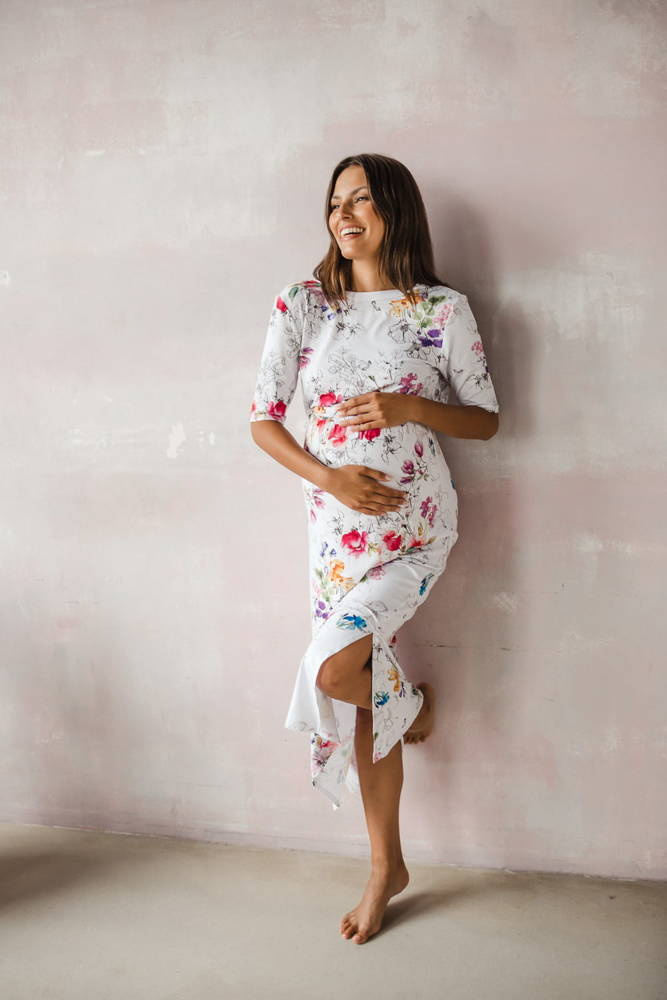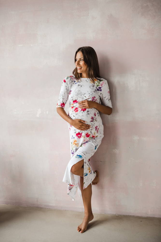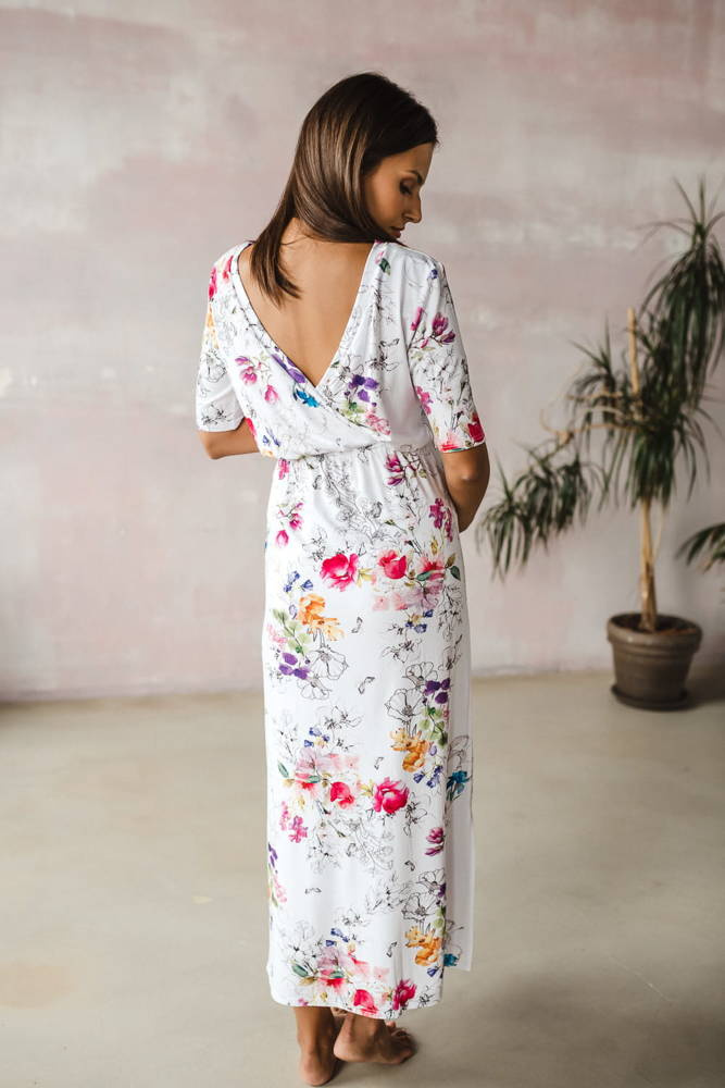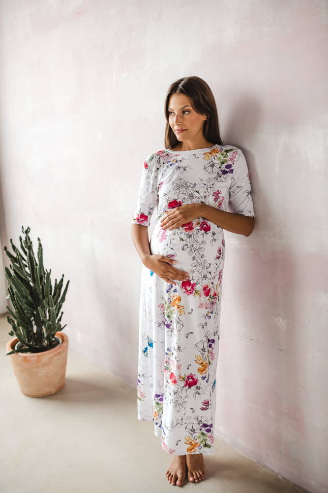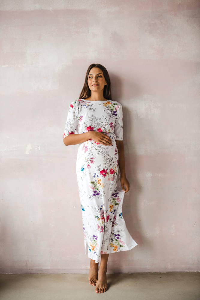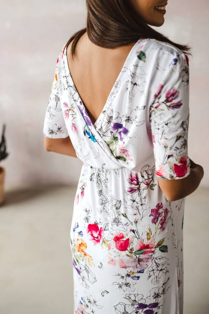 Two Ways LONG Sukienka do karmienia ciążowa krótki rękaw Milk&Love biała w kolorowe kwiaty