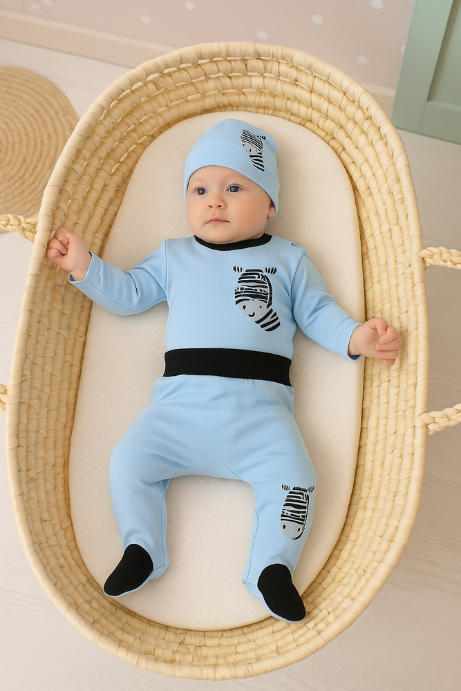 Mamy do zaoferowania komplet niemowlęcy, który składa się z półśpiocha, łapek niedrapek, bucików, czapki i body. Ubranka zostały wykonane z wysokiej jakości 100% bawełny, ozdobione wesołym sitodrukiem.