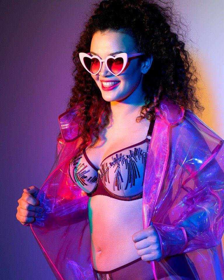 Miseczki wykonane ze śnieżnobiałego tiulu haftowanego w trójkolorowe błyszczące promienie podszyte zostały w dolnej części przyjemną dla ciała pianką. Satynowe białe taśmy, którymi obszyte są tunele zbiegają się między piersiami, gdzie połyskuje złoty medalik z logotypem AVA. Dopracowana w każdym calu konstrukcja pozwala na stabilne podtrzymanie biustu i wyeksponowanie atutów dekoltu.
