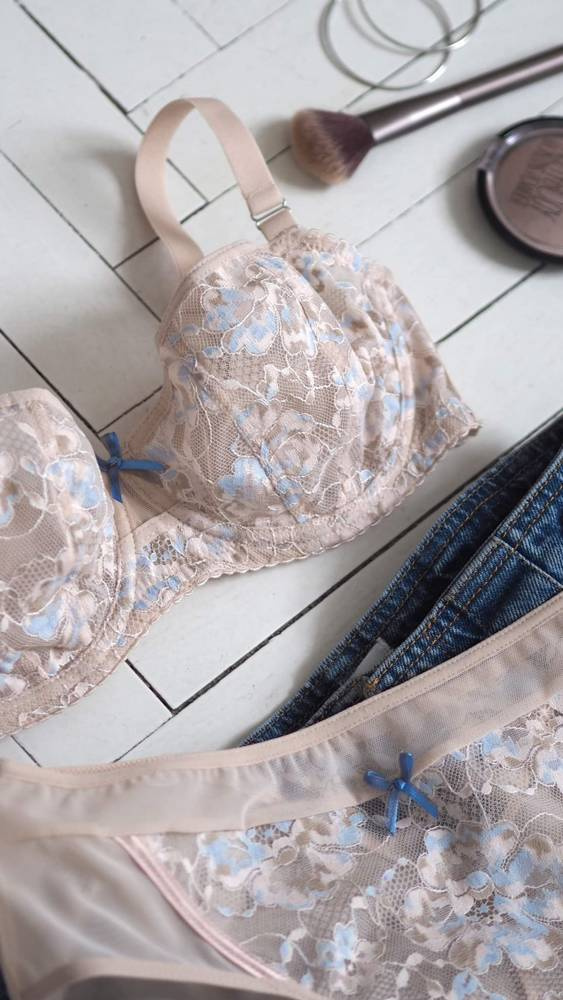 Biustonosz damski typu balkonetka. Miseczki wykonane z siatki, na którą została naszyta bezowo-błękitna koronka. Do kompletu polecamy figi.