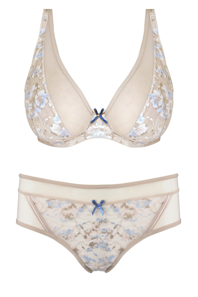 Miseczki z jednym pionowym cięciem przez całą długość. Miseczki są tak wyprofilowane, że nadają naturalny kształt. Konstrukcja idealna na mały i średni biust. Zastosowane materiały dają gwarancję niezwykłego komfortu. Szerokie, komfortowe ramiączka. Środek biustonosza ozdobiony niebieską kokardką, która nadaje elegancji.
