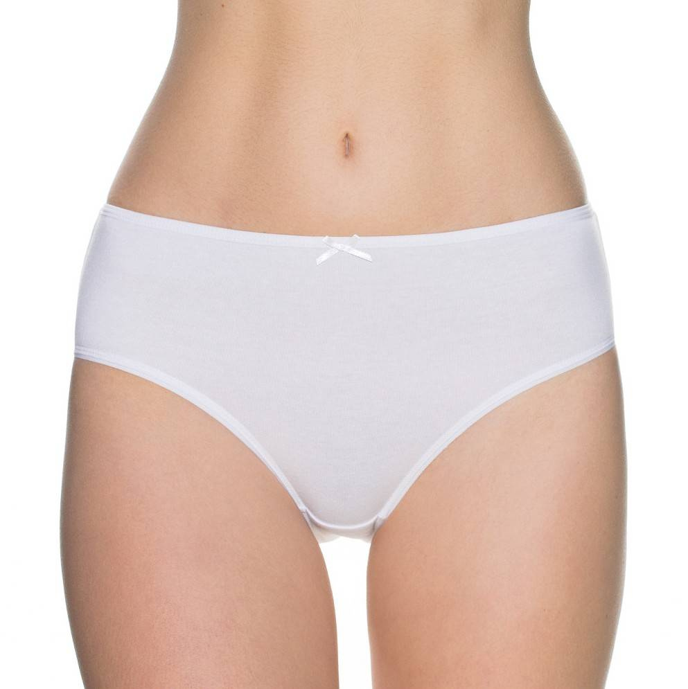 Klasyczne figi damskie typu bikini. Wykonane z wysokiej jakości bawełny. Pakowane w foliowy woreczek po trzy sztuki w kolorze białym.