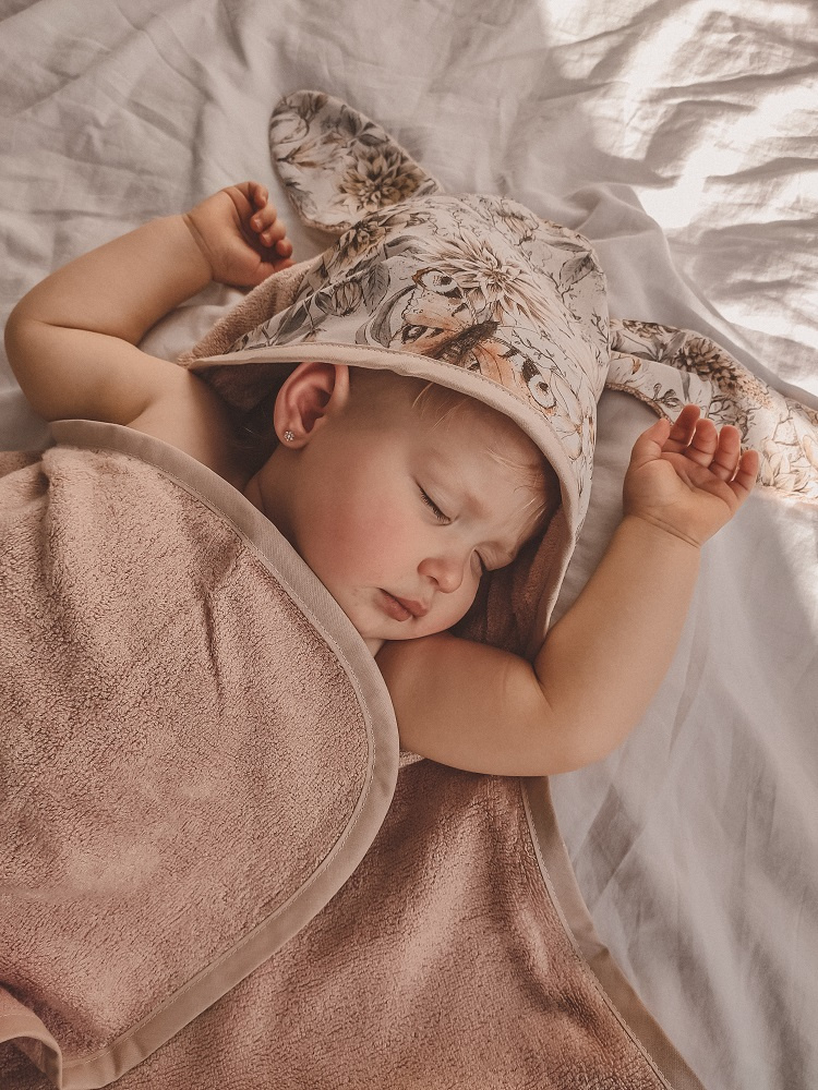 Sprawdzi się również na basenie, czy na plaży, otuli i ogrzeje delikatną skórę dziecka. Posiada praktyczny kapturek ze wzorem kolekcji, na kapturku przesłodkie uszka, a cały jest obszyty elegancką lamówką. W górnym rogu ręczniczek ma troczek ułatwiający zawieszenie.