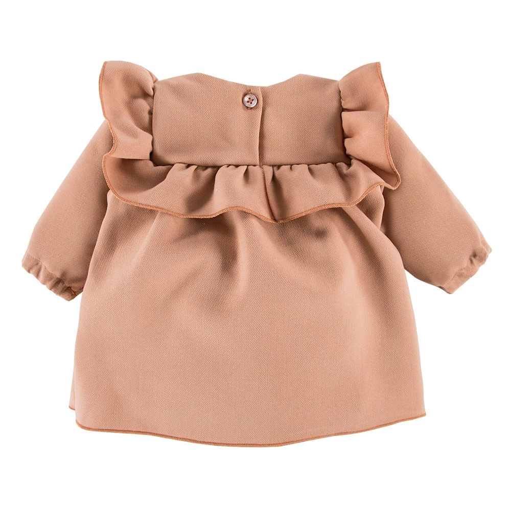 Elementem ozdobnym sukienki są falbany. Krój sukieneczki jest rozkloszowany. Rękawki delikatnie poszerzone. Z tyłu znajduje się zapięcie na dwa ozdobne guziczki. Rękawki zakończone gumką, dzięki temu sukienka wygląda niezwykle elegancko.
