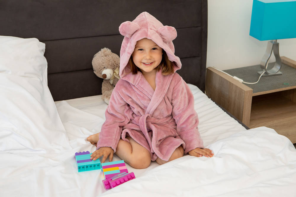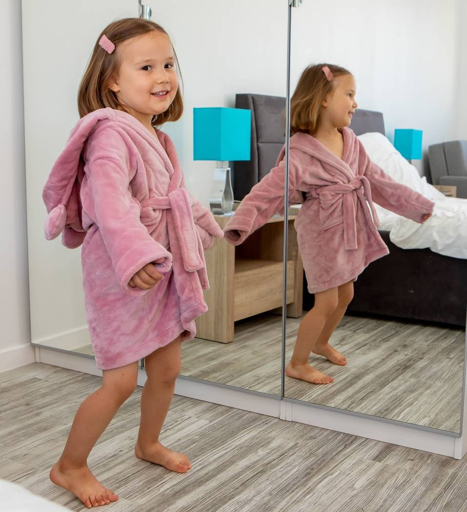 Niezwykle ciepły i przyjemny w dotyku szlafrok dziecięcy Teddy. Posiada wiązanie w pasie i praktyczne kieszenie. Kaptur z uroczymi uszkami.