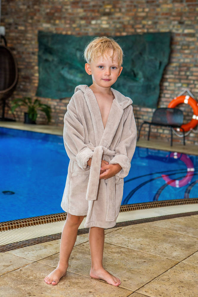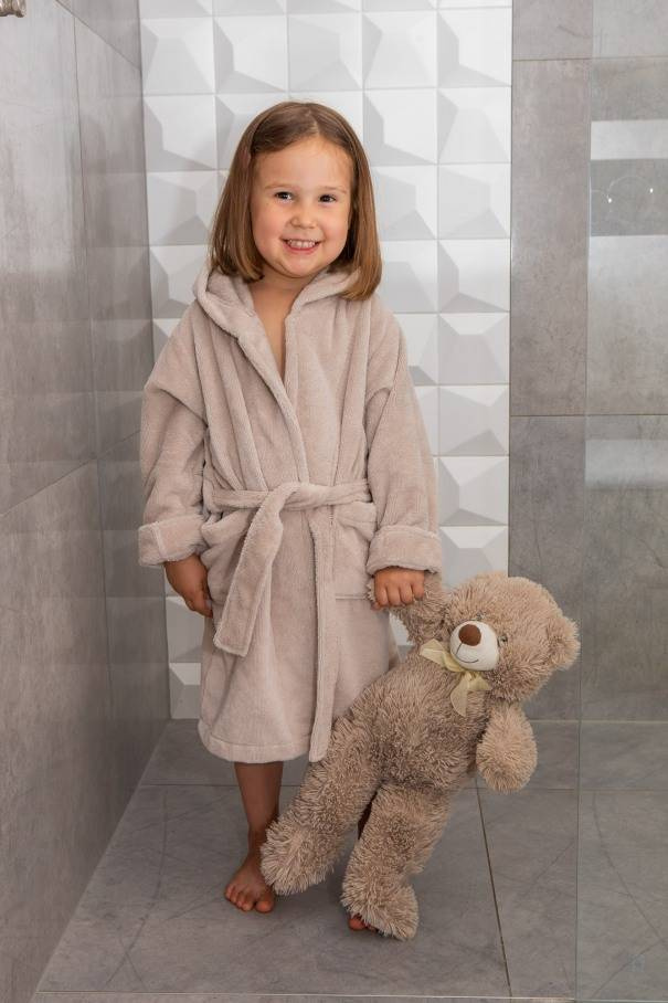 Wyjątkowy szlafrok dziecięcy uszyty z miękkiej i delikatnej, a zarazem niezwykle chłonnej tkaniny. Wewnętrzna strona tkaniny, która ma styczność ze skórą dziecka jest wykonana z przędzy bambusowo-bawełnianej jest przyjemna i delikatna dla skóry maluszka.