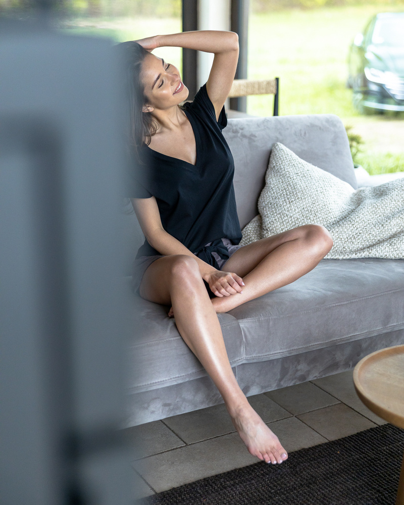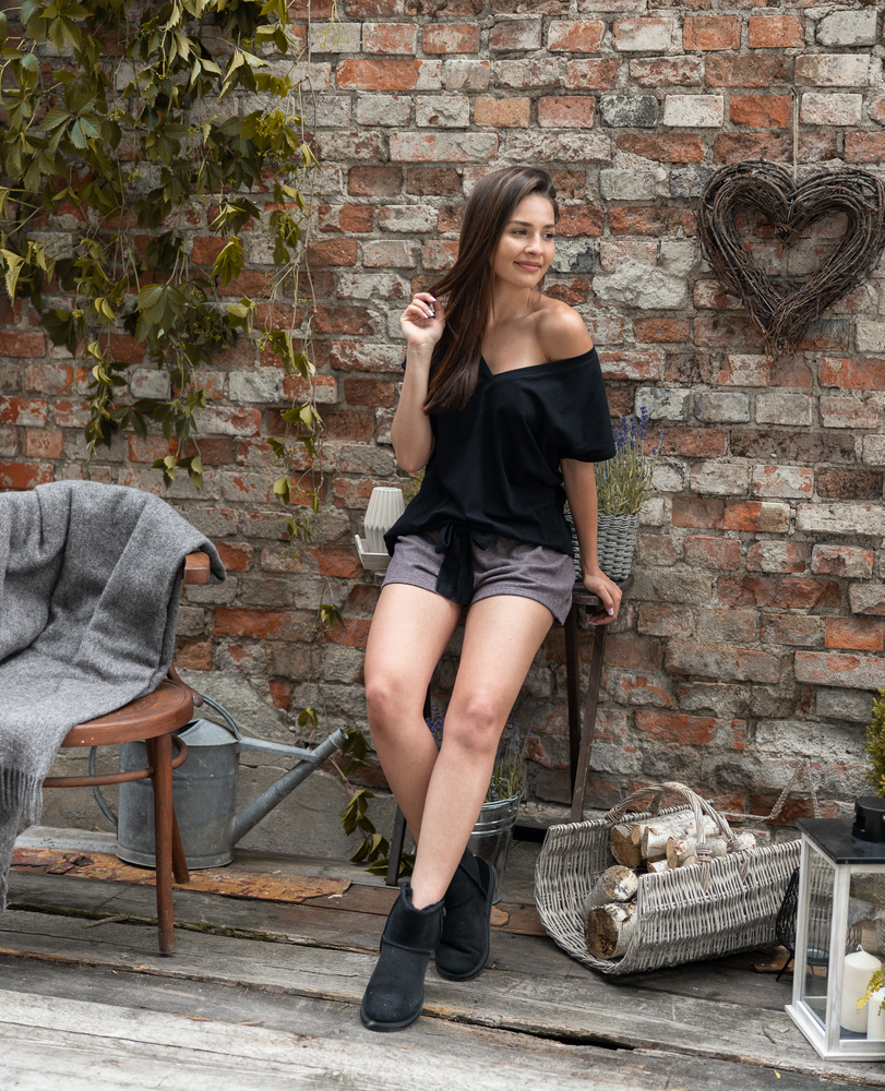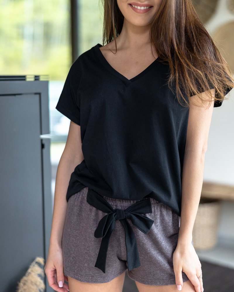 Wygodna piżama damska wykonana z wysokiej jakości delikatnej bawełny oraz wiskozy. Bluzka z krótkim rękawem, duży dekolt w kształcie litery V. Do kompletu krótkie wiskozowe spodnie wiązane w pasie bawełnianym paskiem. Bardzo stylowy fason, delikatnie dopasowany do ciała. Spodoba się kobietom, które uwielbiają delikatność i swobodę.