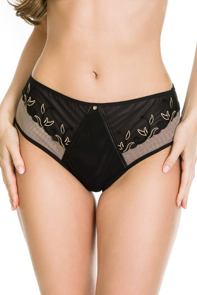 Przód z ozdobnym  haftem, boki i tył wykonane z tiulu, płaskie wykończenie na pośladkach.
