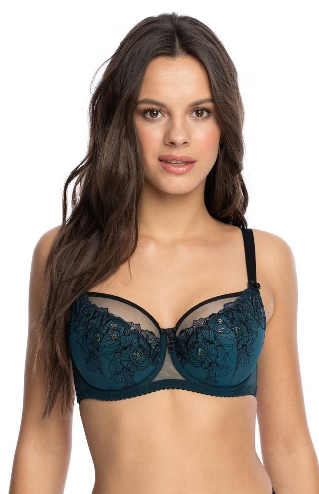 Biustonosz półusztywniany wykonany z mikrofibry oraz siateczki z ozdobnym haftem