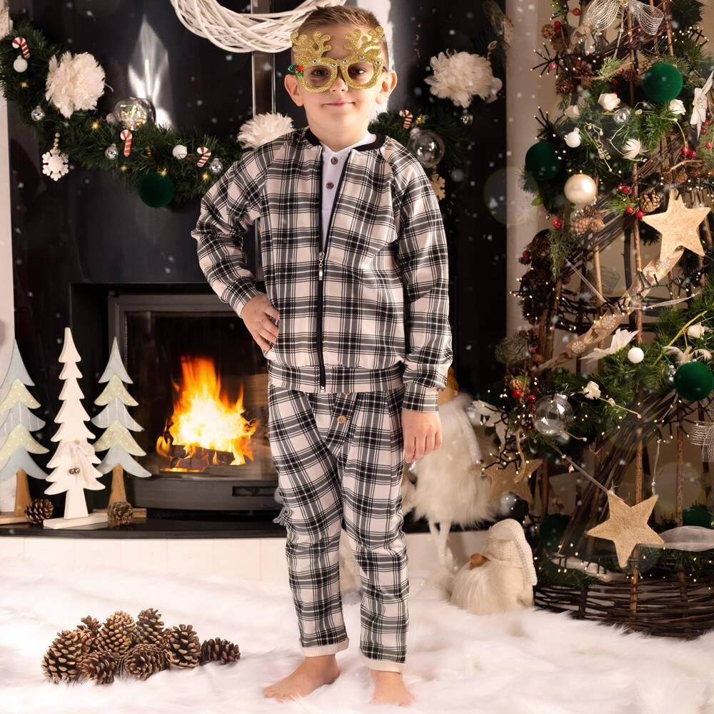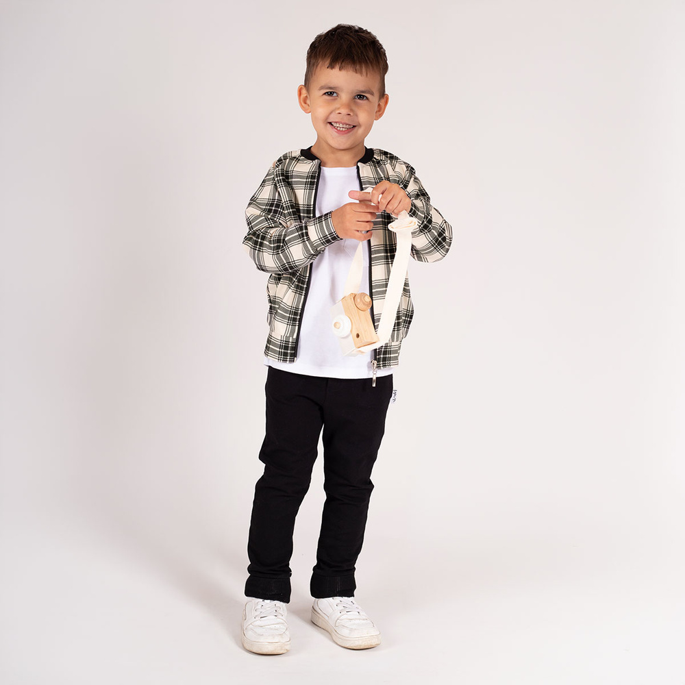 Sportowa bluza boomerka, uszyta z bawełny dresowej w kratkę beżowo-czarną. Przy rękawach, szyi oraz w pasie wszyto ściągacze pod kolor modelu. Zapinana jest na zamek. Materiał posiada certyfikat Oeko-Tex Standard 100 Tekstylia godne zaufania. Produkt zdobią kieszonki.