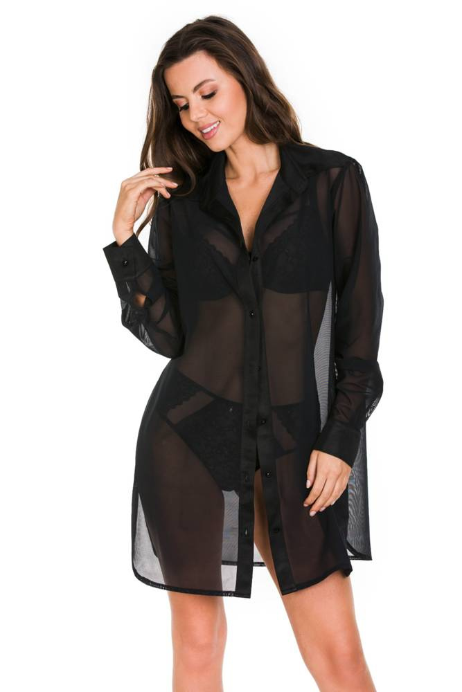 Elegancka koszula wykonana z tiulu. Na bokach rozcięcie. Satynowy kołnierzyk, mankiety i listwy z guzikami.