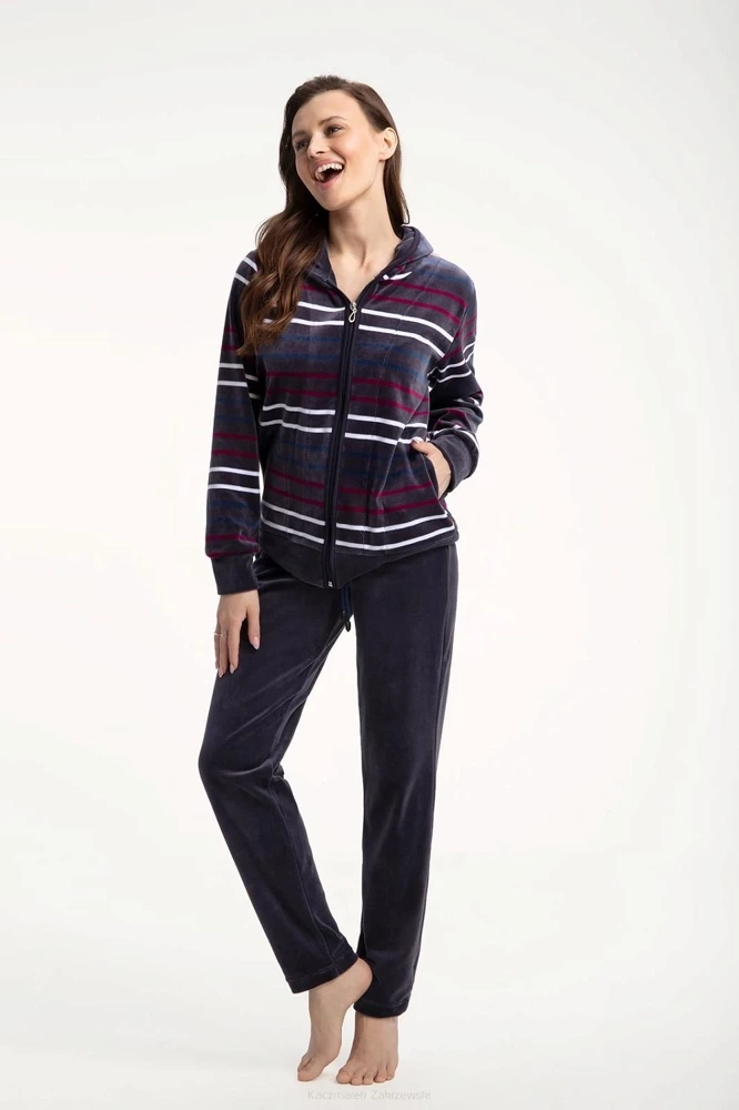 Dres damski z weluru to maksymalny komfort, elegancja i klasyczne rozwiązanie, które doskonale sprawdzi się na wiele okazji. Bluza dresowa damska w poziome paski sprawia, że sylwetka prezentuje się niezwykle kobieco. Model posiada zamek ekspresowy, wygodne kieszenie i kaptur. Krój, jak i samo wykończenie sprawiają, że bluza jest uniwersalna.Spodnie dresowe posiadają długie, proste nogawki.