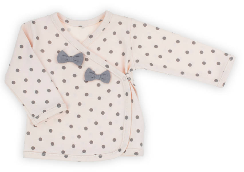 Bawełniana koszulka dla dziewczynki,uszyta z materiału jasny łosoś w beżowe groszki. Ubranko posiada zakładany przód,zapinany na wygodne bezniklowe napy. Koszulkę zdobią na przodzie dwie beżowe kokardki. Materiał posiada certyfikat Oeko-Tex Standard 100 Tekstylia godne zaufania.