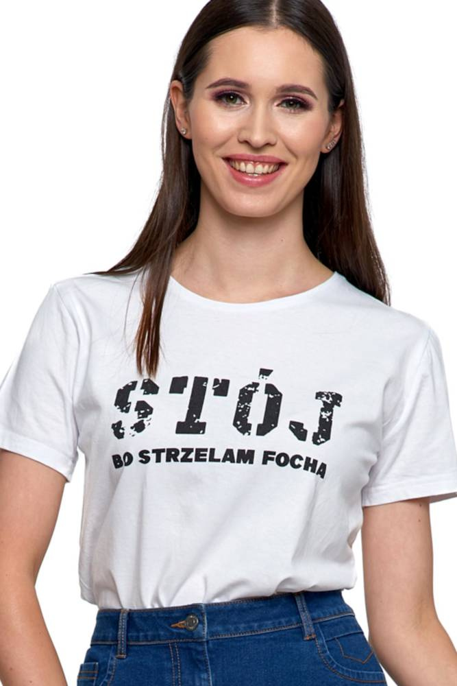 T-shirt damski z krótkim rękawkiem, o klasycznym kroju. Uszyty został z wysokogatunkowej bawełny.