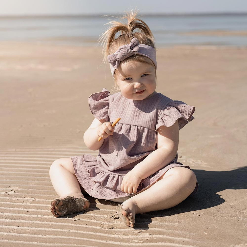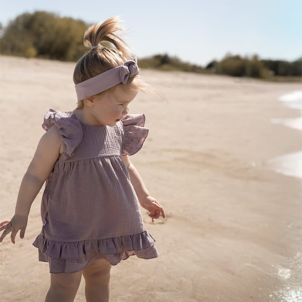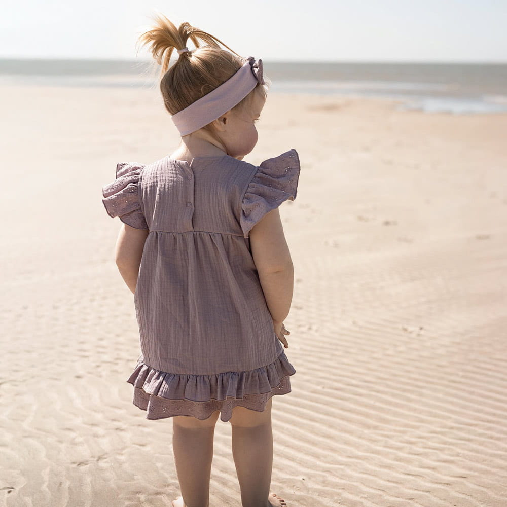 Sukienka dziecięca z kolekcji Botanic uszyta z miękkiego i przyjemnego w dotyku muślinu. Sukienka rozpinana na dwie napy z tyłu. Elementem ozdobnym są falbanki wszyte w ramionkach oraz na dole sukienki.
