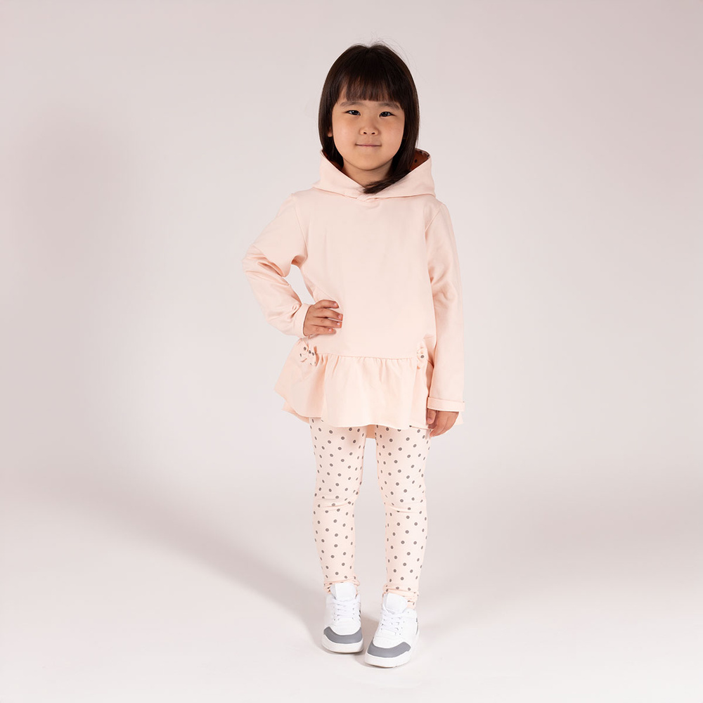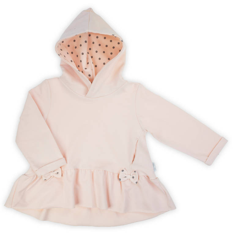 Przepiękna, luźna, dziewczęca tunika dresowa w kolorze łososiowym. Posiada kaptur, który przyda się na chłodniejsze dni. Dół tuniki zdobi marszczona falbanka. W modelu tym znalazły sie również praktyczne kieszonki, całość zdobią grafitowe kokardki na przodzie. Wygodna i unikatowa z pewnością stanie się ulubioną częścią garderoby naszej pociechy.