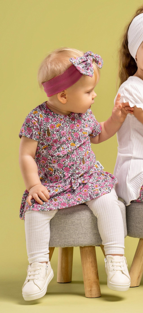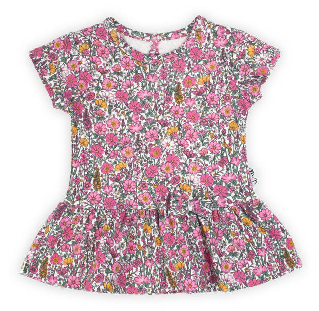 Bluzeczka z krótkim rękawem dla dziewczynki. Uszyta z drukowanej 100% bawełny. Druk przedstawia piękną kolorową łąkę. Materiał posiada certyfikat Oeko-Tex Standard 100 Tekstylia godne zaufania. Fason zdobi w dolnej części falbanka oraz kokardka na przodzie produktu. W modelu na tyle zastosowano zapięcie typu łezka, zapinane na bezniklowego napa.