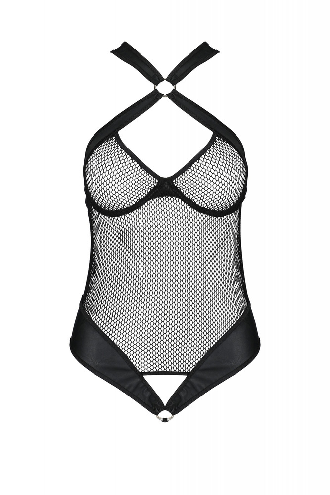 Zmysłowe połączenie skóry z siateczką, która uwodzicielsko opinając się uwydatnia biust i subtelnie odkrywa ciało, a pozłacane łączenia w postaci kółek nadają całości pazur.