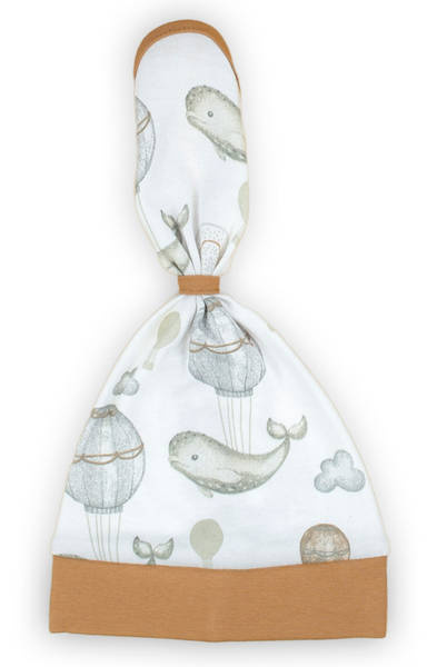 Chustka na głowę, idealna na gorące dni. Wykonana z białej bawełny w wieloryby i balony. Materiał posiada certyfikat Oeko-Tex Standard 100 Tekstylia godne zaufania. Wykończony ściągaczem, który dobrze dopasuje się do główki dziecka. Produkt jest wygodny i przewiewny, będzie idealnym dopełnieniem kolekcji Miki.