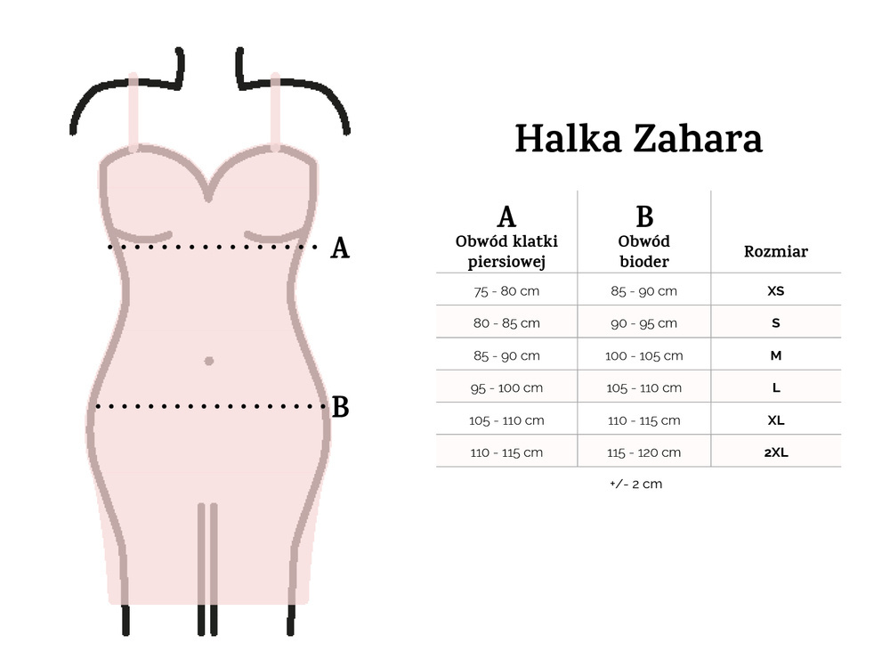 Zmysłowa haleczka wykonana z delikatnej satyny. Halka ma regulowane ramiączka, więc możesz decydować o ich długości. Dół halki wykonany został z eleganckiej satyny wykończonej koronką co dodaje delikatności. Halka Zahara sprawia, że każda kobieta poczuje się pięknie i zmysłowo. Dodatkowo satyna sprawia, że będziesz czuła się komfortowo podczas jej noszenia oraz snu. Nie czekaj i zamów już dziś przepiękną koszulkę nocną.