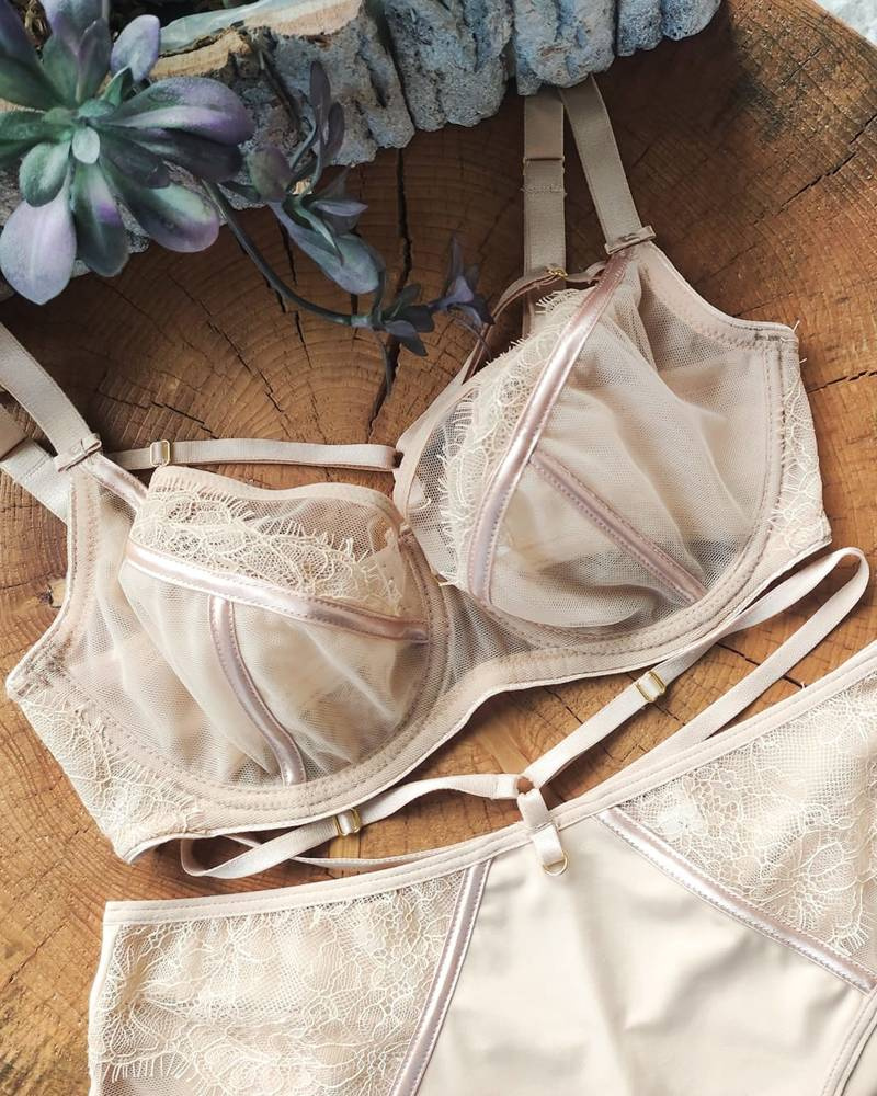 Miseczki wykonane z siatki, na którą naszyta została koronka. Dekolt zdobią paseczki z regulacją, które można odpiąć. Nieodpinane regulowane ramiączka. Do kompletu polecamy figi.