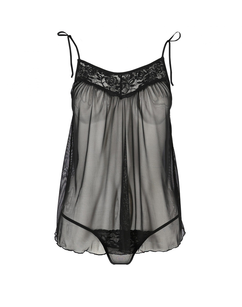 Zmysłowa halka uszyta z elastycznego materiału. Całość dopełnia zmysłowe zdobienie z koronki umiejscowione na dekolcie. Do koszulki dołączone są stringi.