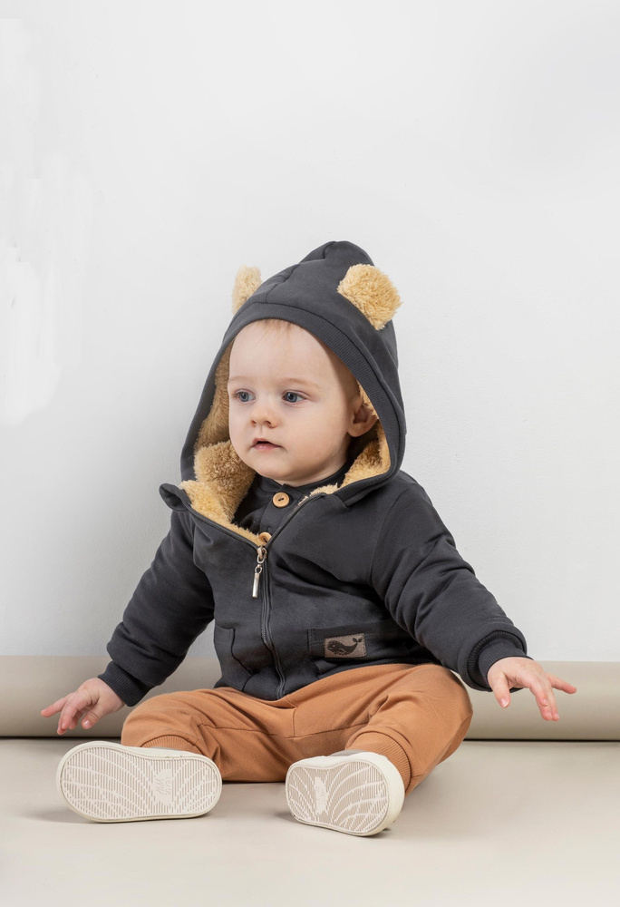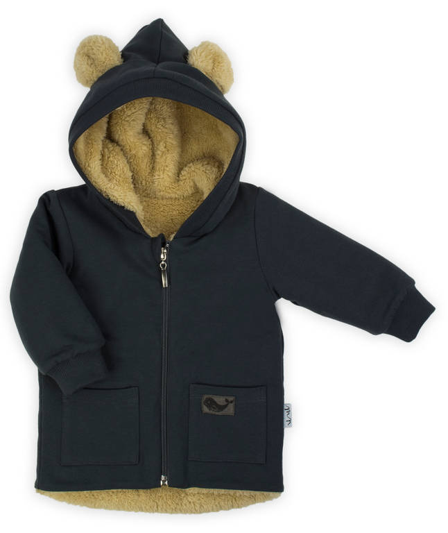 Ciepła kurteczka z kapturem dla chłopaka wykonana z grafitowej bawełny dresowej. Posiada niewielką domieszkę elastanu, co powoduje, że materiał nie odkształca się. Od wewnątrz jest podszyta beżowym futerkiem.Materiał posiada certyfikat Oeko-Tex Standard 100 Tekstylia godne zaufania. Fason rozpinany na zamek,przód zdobią kieszonki oraz naszywka z wielorybem nawiązująca do kolekcji Miki. Wygodny kaptur z beżowymi uszkami ochroni maluszka przed zimnem.