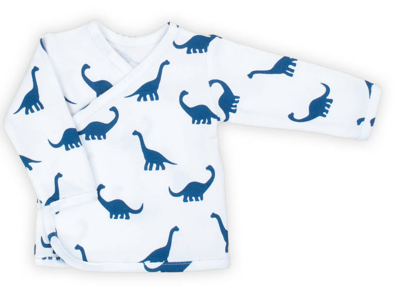 Wygodna koszulka dla chłopca ,uszyta z białej bawełny w dinozaury w morskim kolorze. Materiał posiada certyfikat Oeko-Tex Standard 100 Tekstylia godne zaufania. Ubranko ma zakładany przód, zapinany na wygodne bezniklowe napy. Model posiada praktyczne wywinięcia w rękawach w rozmiarze 56 ,chroniące maluszka przed zadrapaniem.