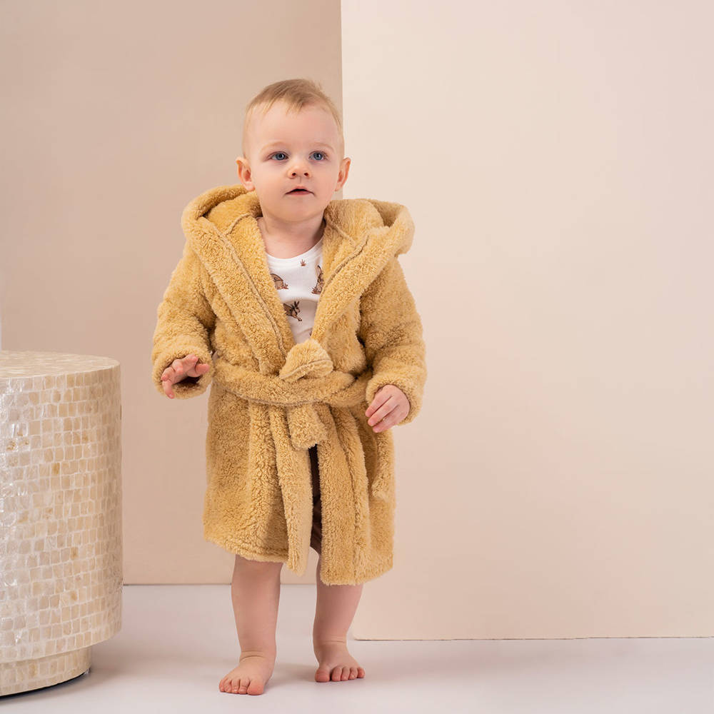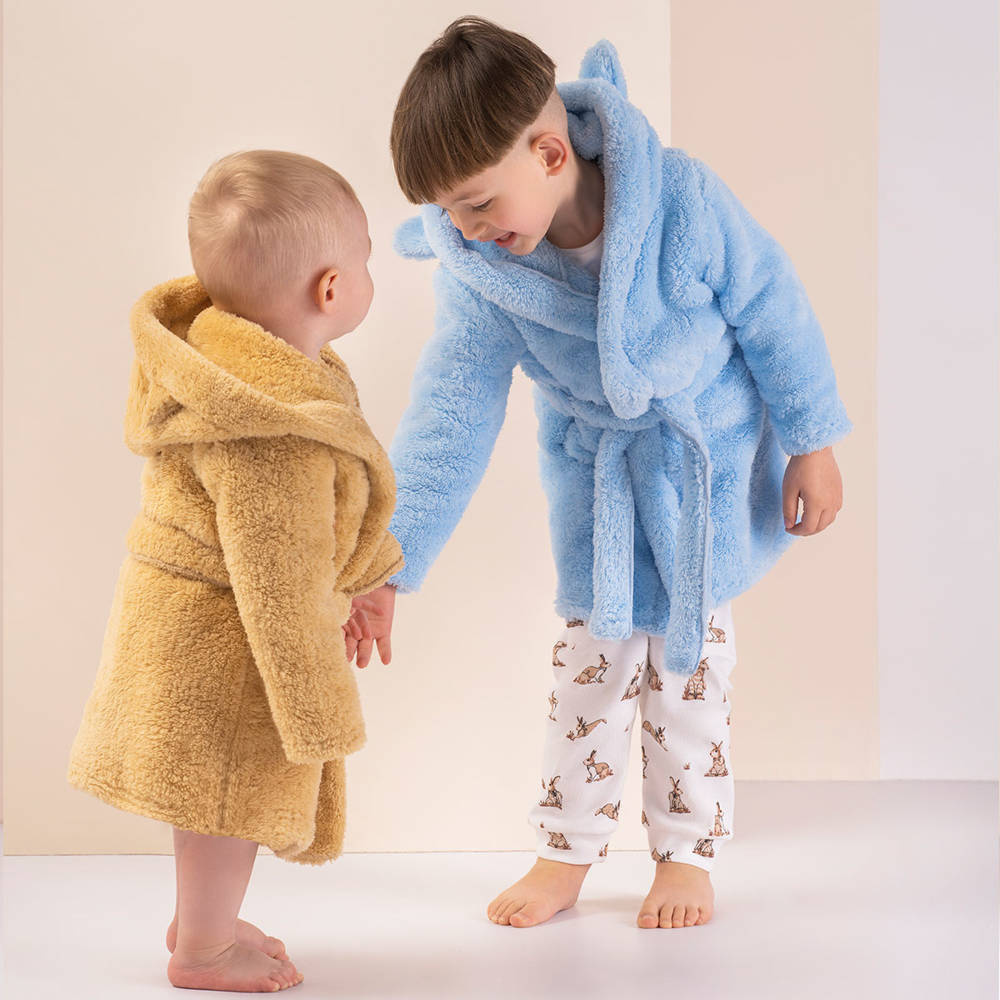 Szlafrok dziecięcy wykonany z cieplutkiego materiału, który jest całkowicie bezpieczny dla skóry dziecka. Zdobią go uszka, wiązany w pasie. Produkt będzie świetnym okryciem po kąpieli lub prezentem dla dziecka.