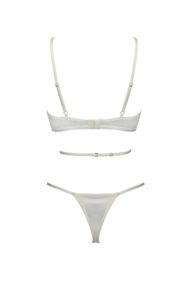 Komplet biustonosz + stringi. Nietypowy, fantazyjny krój i urocza koronka nadaje jedynego w swoim rodzaju uroku do całości.