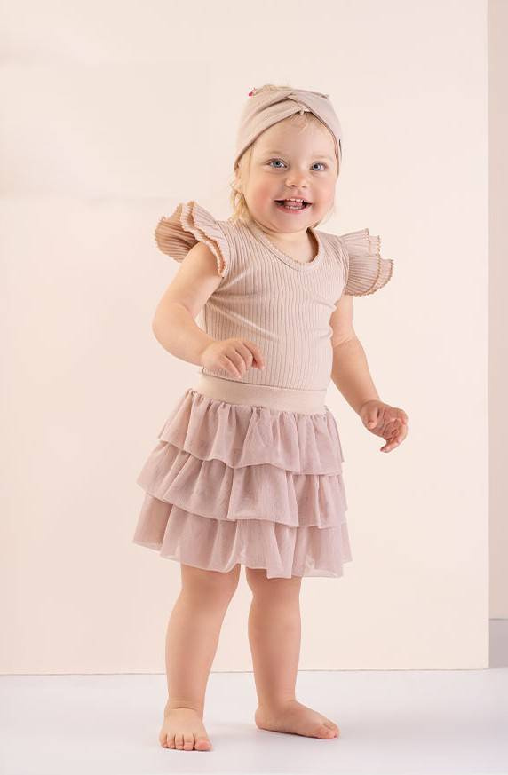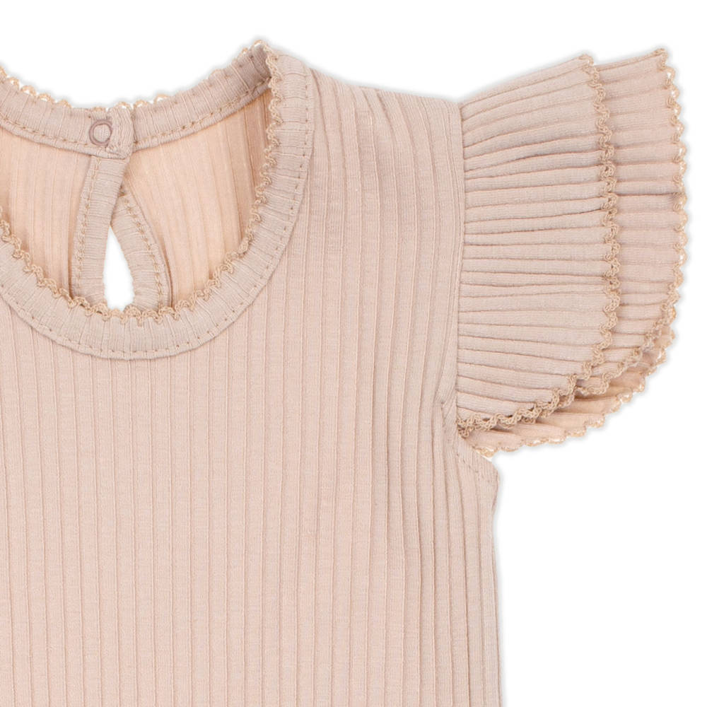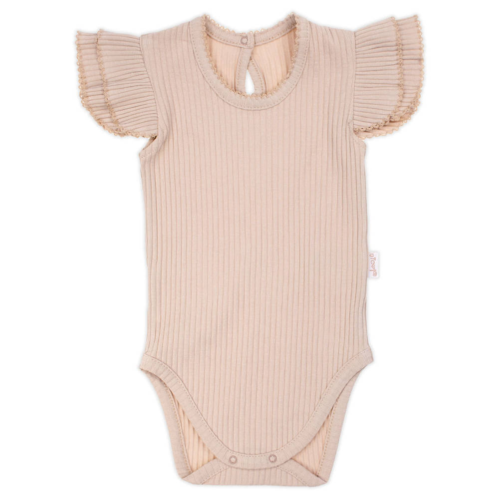 Body na ramiączkach, uszyte z beżowej prążkowanej bawełny z niewielką ilością elastanu. Materiał posiada certyfikat Oeko-Tex Standard 100 Tekstylia godne zaufania. Zapinane na wygodne bezniklowe napy. Body idealne na lato, ozdobione zostało marszczonymi podwójnymi motylkami. Dekolt i motylki wykończone zostały ozdobną nitką w kolorze beżowym. W modelu tym zastosowano na tyle zapięcie typu łezka.