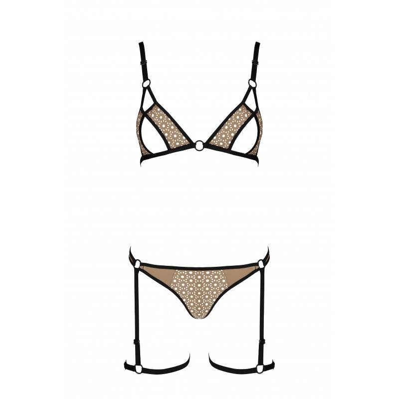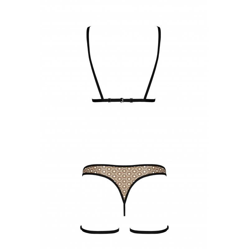 Zmysłowe wycięcia oraz ażurowe zdobienia w fantazyjny sposób podkreślają biust. Paski okalające uda oraz liczne łączenia w kształcie kółek tworzą komplet jedyny w swoim rodzaju.