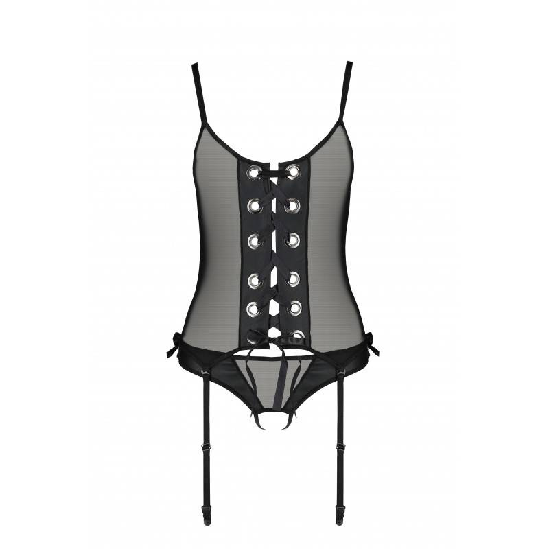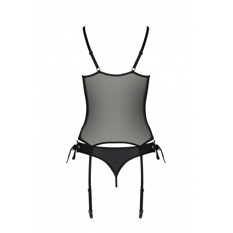 Gorset łącząc w sobie czarny tiul oraz ponadczasową skórę nieśmiało odkrywa kobiece ciało spod bielizny a gorsetowe wiązania są nie tylko ozdobą, ale również odpowiadają za odpowiednie dopasowanie całości kompletu do potrzeb każdej kobiety.