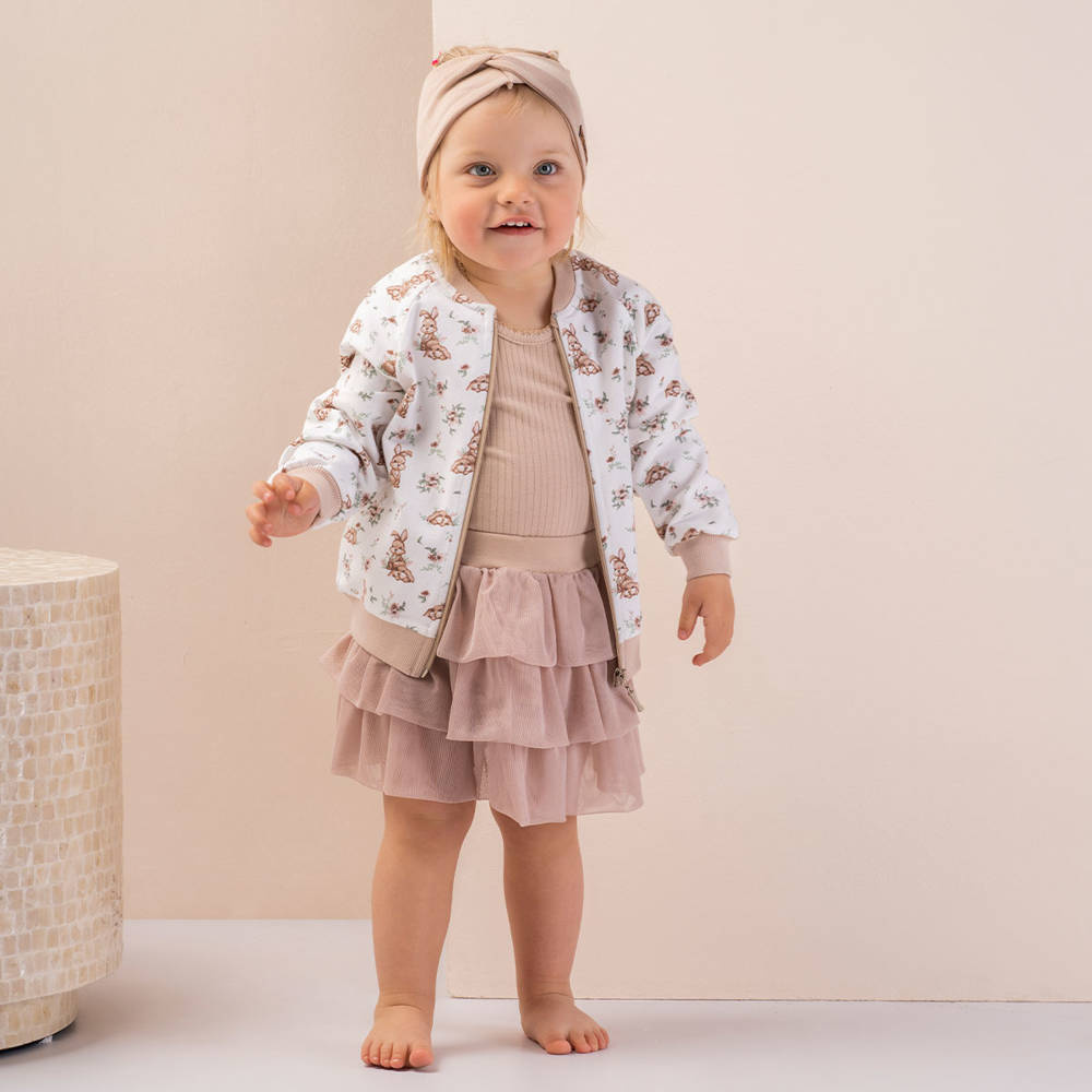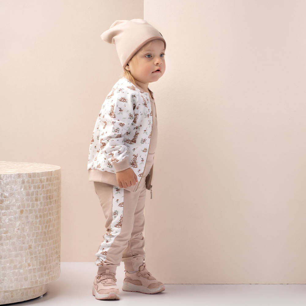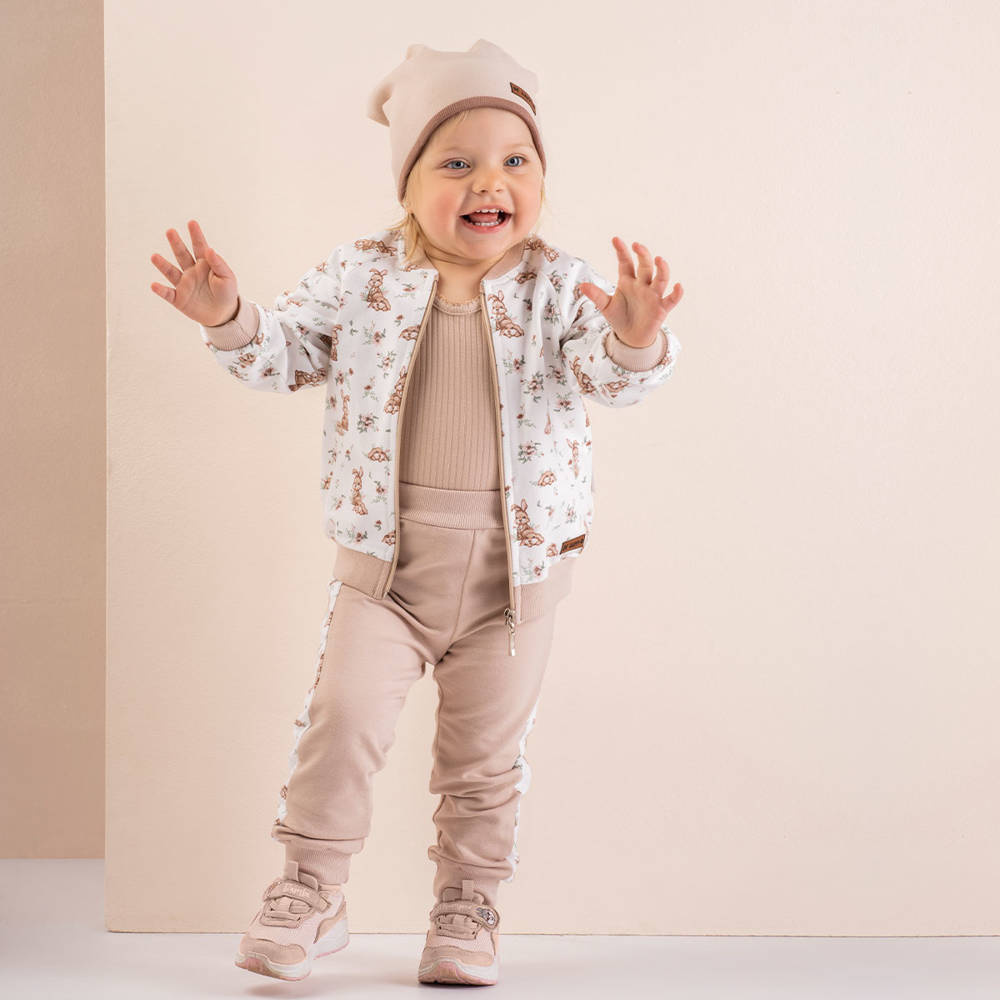 Bluza boomerka dla dziewczynki. Za równo sportowa ,jak i do ubioru wyjściowego. Uszyta z drukowanej bawełny dresowej z niewielką ilością elastanu. Druk przedstawia zajączki w odcieniach brązu pośród delikatnej łąki. Przy rękawach oraz w pasie i szyji wszyto ściągacze w kolorze beżowym. Zapinana na wygodny zamek. Od rozmiaru 74 zastosowano w boku kieszonki. Przód zdobi naszywka "BE HAPPY" Materiał posiada certyfikat Oeko-Tex Standard 100 Tekstylia godne zaufania.