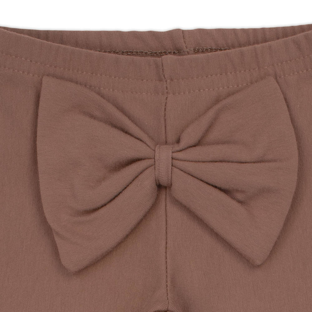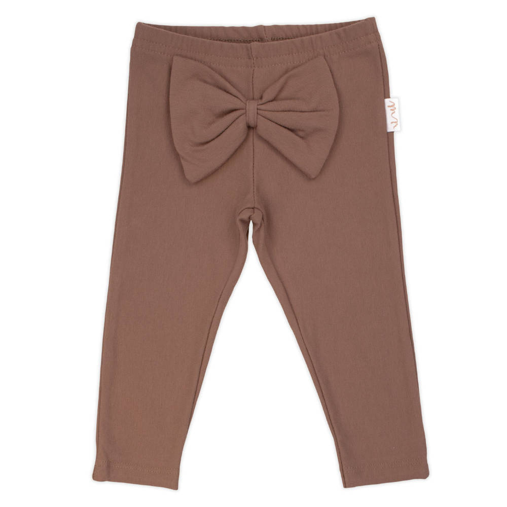 Legginsy uszyte z brązowej, dresowej bawełny z domieszką elastanu, co powoduje, że materiał nie odkształca się a zarazem jest miły w dotyku. W pasie posiadają wygodną gumkę nie uciskającą brzuszka. Gumka została dodatkowo przeszyta aby zapobiec okręcaniu się. Ubranko zdobi duża kokarda na przodzie. Materiał posiada certyfikat Oeko-Tex Standard 100 Tekstylia godne zaufania.