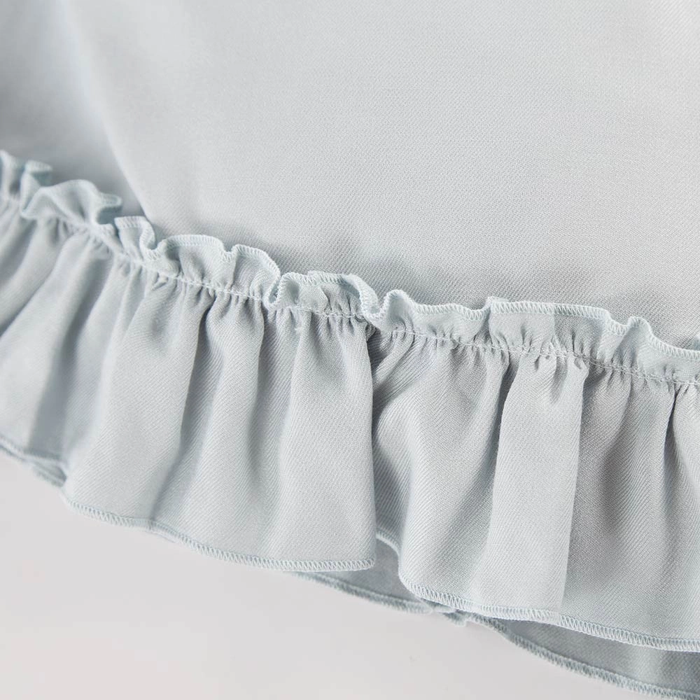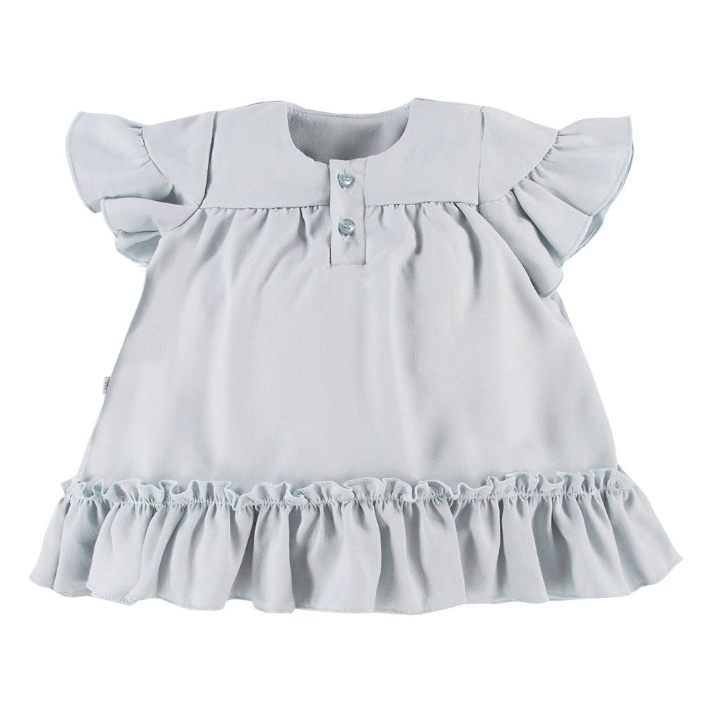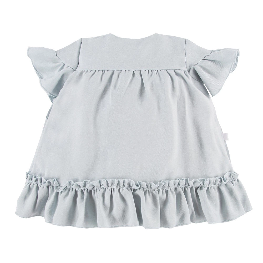 Sukienka dziewczęca z kolekcji "Ceremony" uszyta z miękkiej i przyjemnej w dotyku tkaniny z wiskozy. Posiada ozdobne falbany. Rozpinana z przodu na dwa guziczki. Krój sukienki jest rozkloszowany.