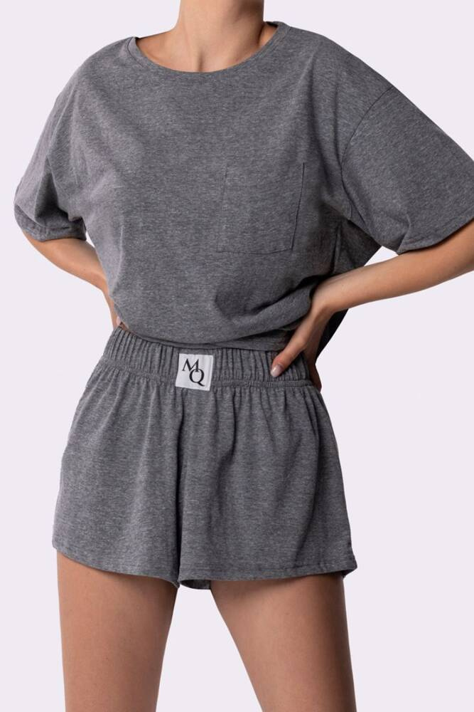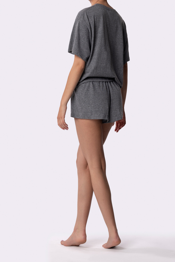 Model z oversizową, wygodną koszulką oraz krótkimi spodenkami podkreślającymi nogi. Spodenki mają nieco wyższy stan oraz szeroką gumę w pasie. Wykonana z niezwykle delikatnej i przewiewnej bawełny, zapewniającej komfort podczas snu.