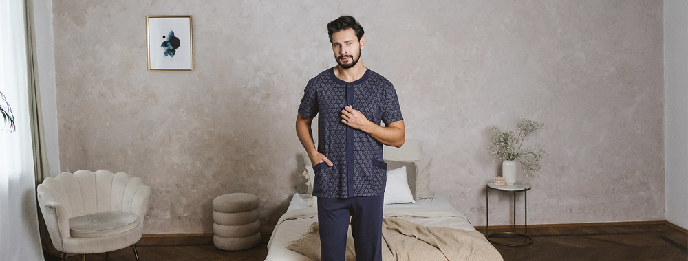 Piżama o klasycznej linii. Przód zapinany na guziki, pod szyją stójka. Bluza z kieszeniami.