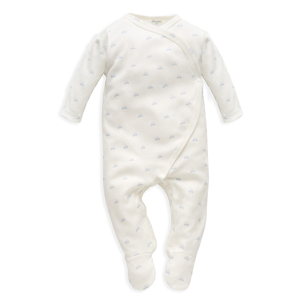 Pajac niemowlęcy z wysokiej jakości bawełny. By ułatwić rodzicom przewijanie maleństwa w kroku umieszczone zostały bezniklowe napki. Po boku pajac zapinany jest na jedną napę, a jego spodnia część przodu wiązana jest delikatną, bawełnianą tasiemką.
