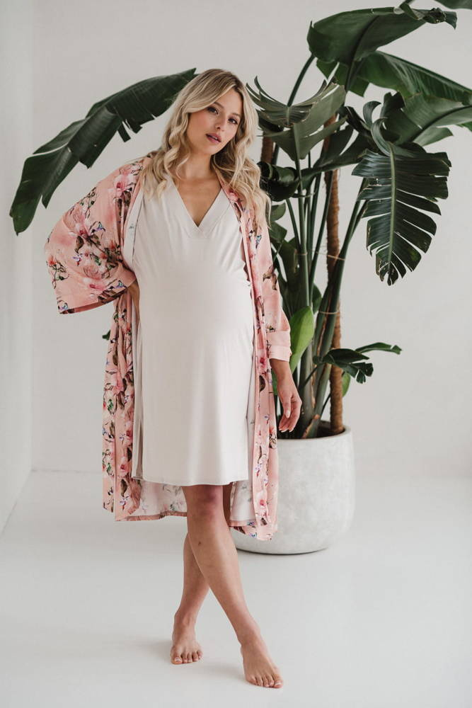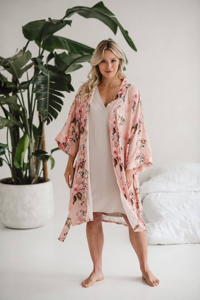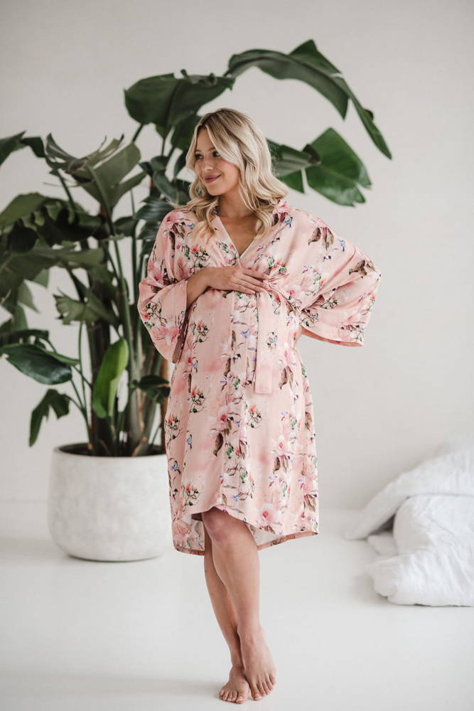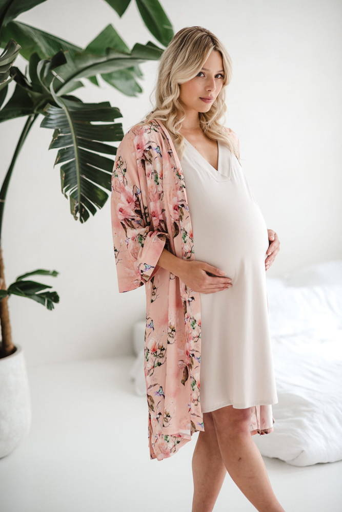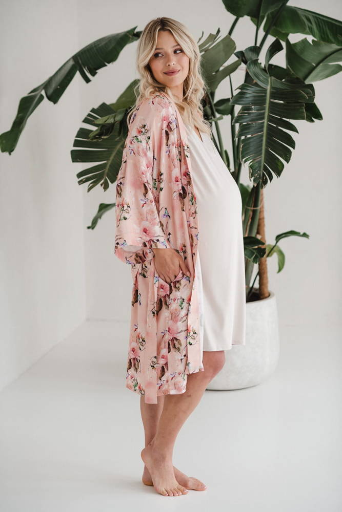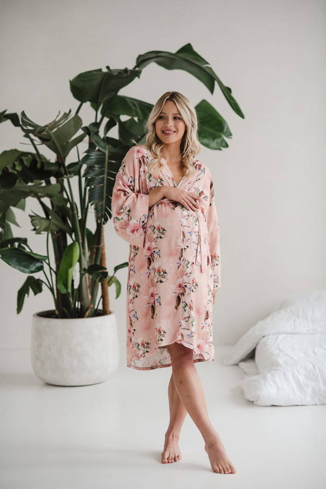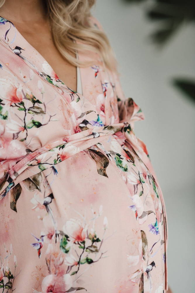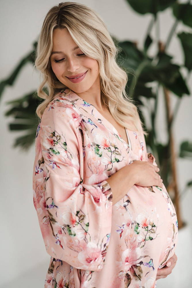 • Szlafrok o kroju kimono został zaprojektowany tak, aby dostosowywał się do zmieniających się kształtów ciała w ciąży i po porodzie