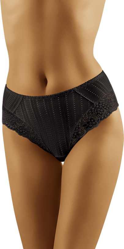 Figi damskie, zabudowane. Przód wykonany z tkaniny w delikatny prążek, po bokach ozdobne koronkowe wstawki. Tył gładki, z wysokiej jakości bawełny ekologicznej z dodatkiem lycry