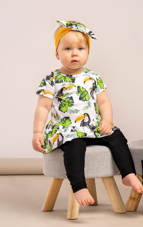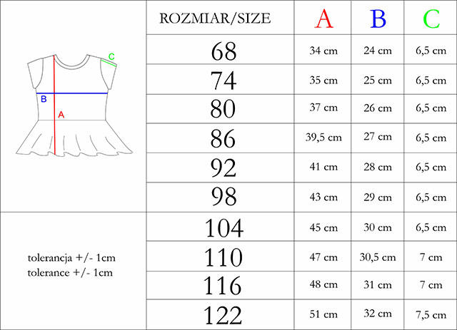 Bluzeczka z krótkim rękawem dla dziewczynki. Uszyta z 100% bawełny. Materiał posiada certyfikat Oeko-Tex Standard 100 Tekstylia godne zaufania. Fason w dolnej części zdobi falbanka oraz kokardka na przodzie produktu. W modelu na tyle zastosowano zapięcie typu łezka, zapinane na bezniklowego napa.
