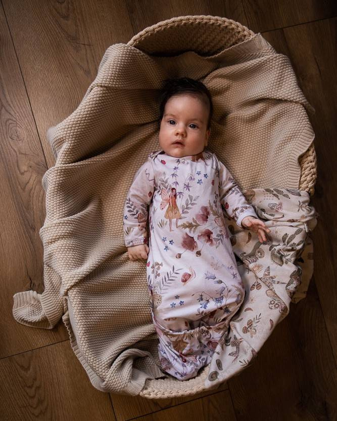 Pierwsze ubranko szyte jest z niezwykle delikatnej dzianiny w 100% bawełnianej, w lekko ciągnący splot, dzięki czemu jest lekko elastyczne, co wpływa na łatwość ubierania.